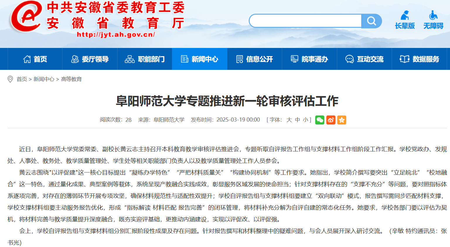 3月19日,安徽教育网报道:阜阳师范大学专题推进新一轮审核评估工作。文章地址: