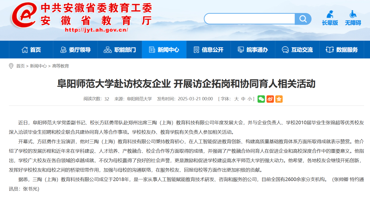 3月21日,安徽教育网报道:阜阳师范大学赴访校友企业 开展访企拓岗和协同育人相关活动。文章地址: