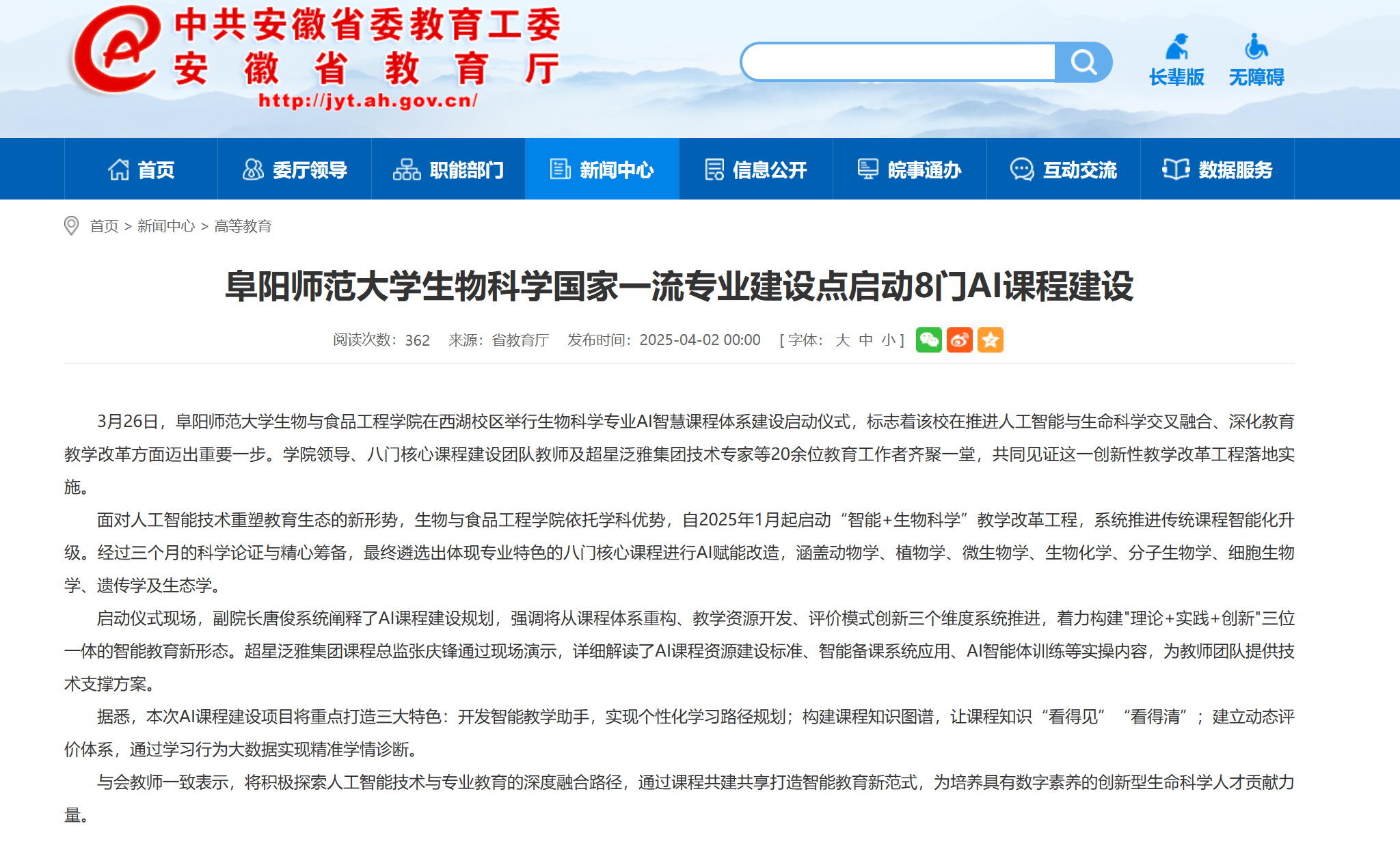 4月2号,安徽教育网报道:阜阳师范大学生物科学国家一流专业建设点启动8门AI课程建设 。文章地址: