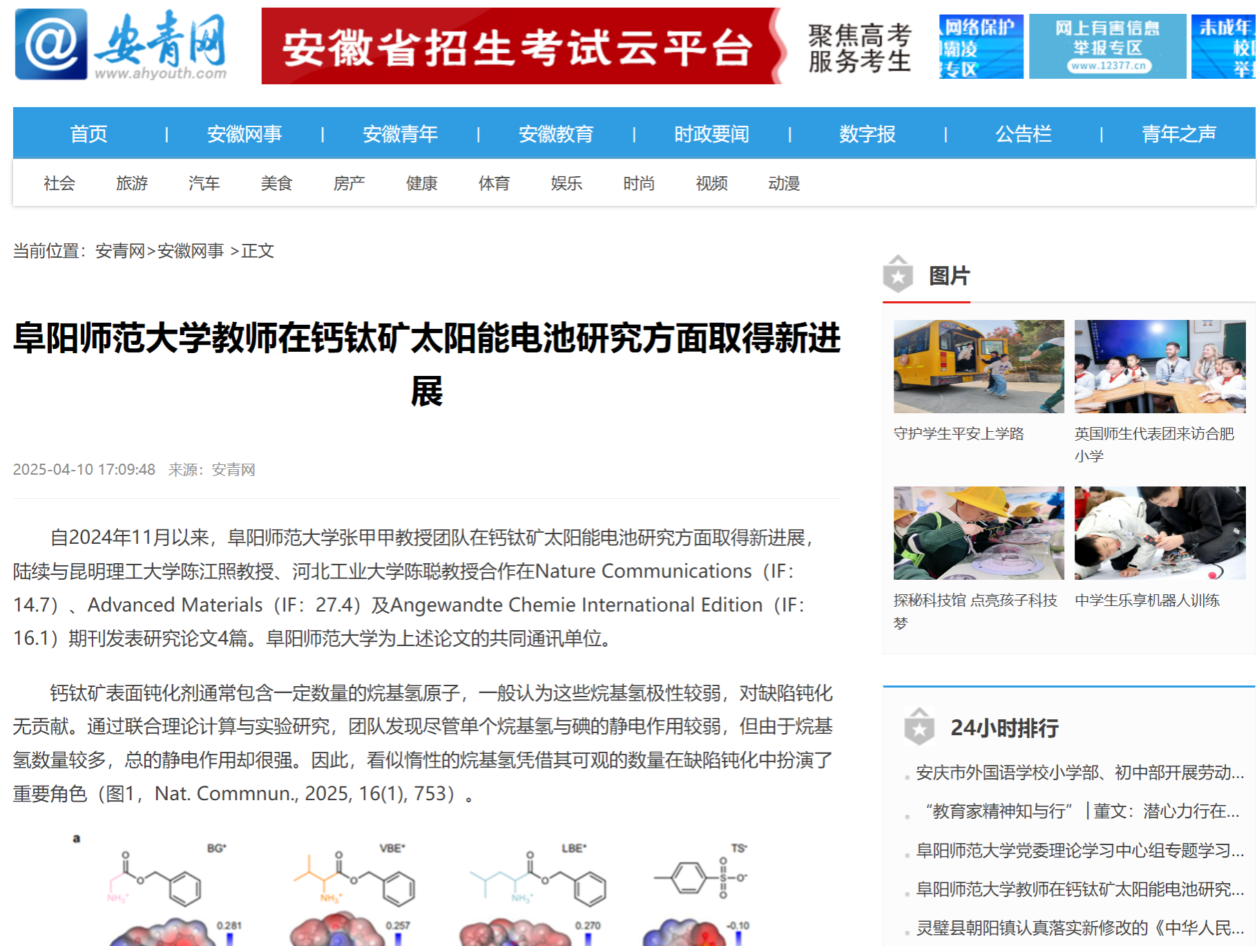 4月10号,安青网报道:阜阳师范大学教师在钙钛矿太阳能电池研究方面取得新进展。文章地址:
