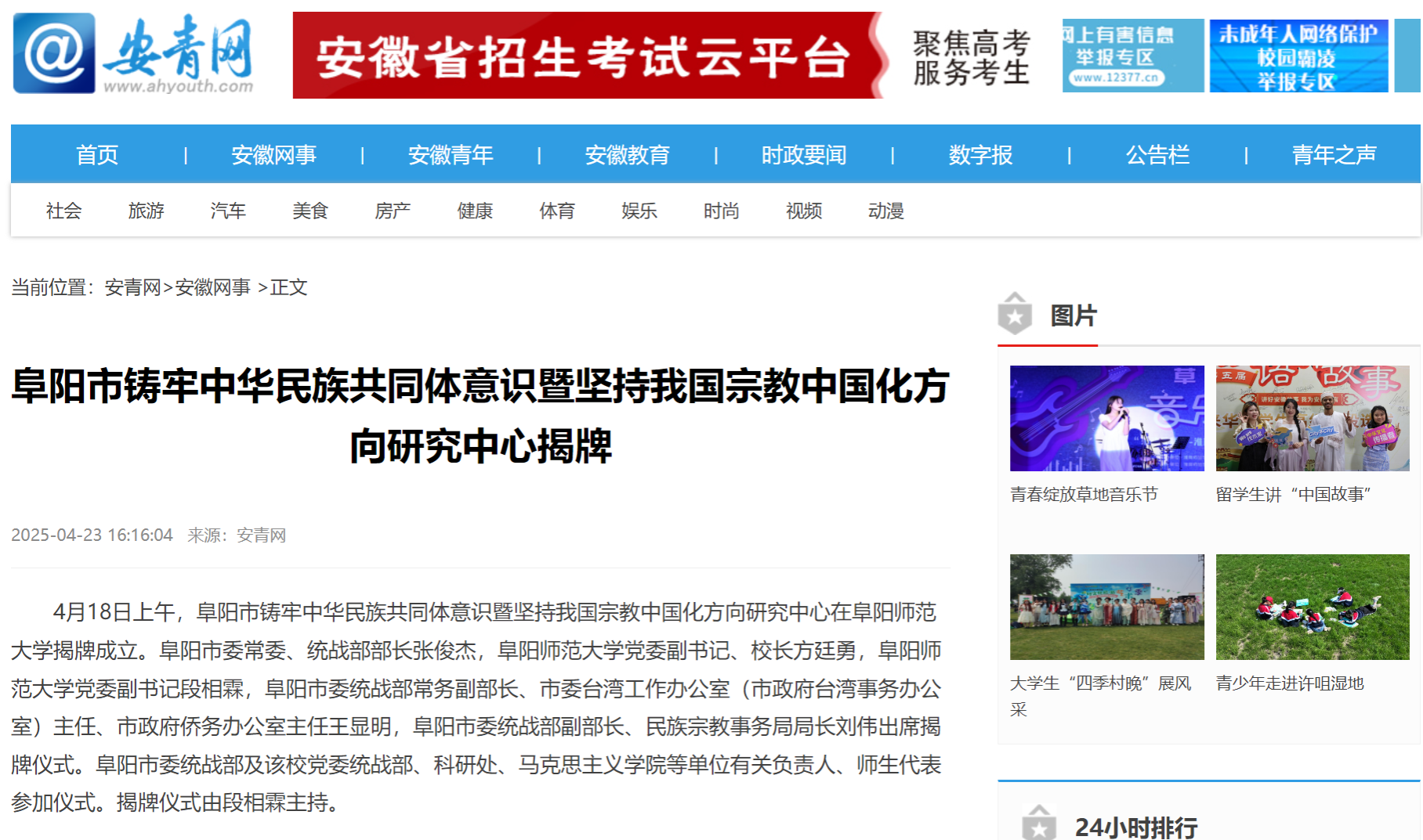 4月23日,安青网报道:阜阳市铸牢中华民族共同体意识暨坚持我国宗教中国化方向研究中心揭牌。文章地址:https://www.ahyouth.com/news/20250423/1757660.shtml