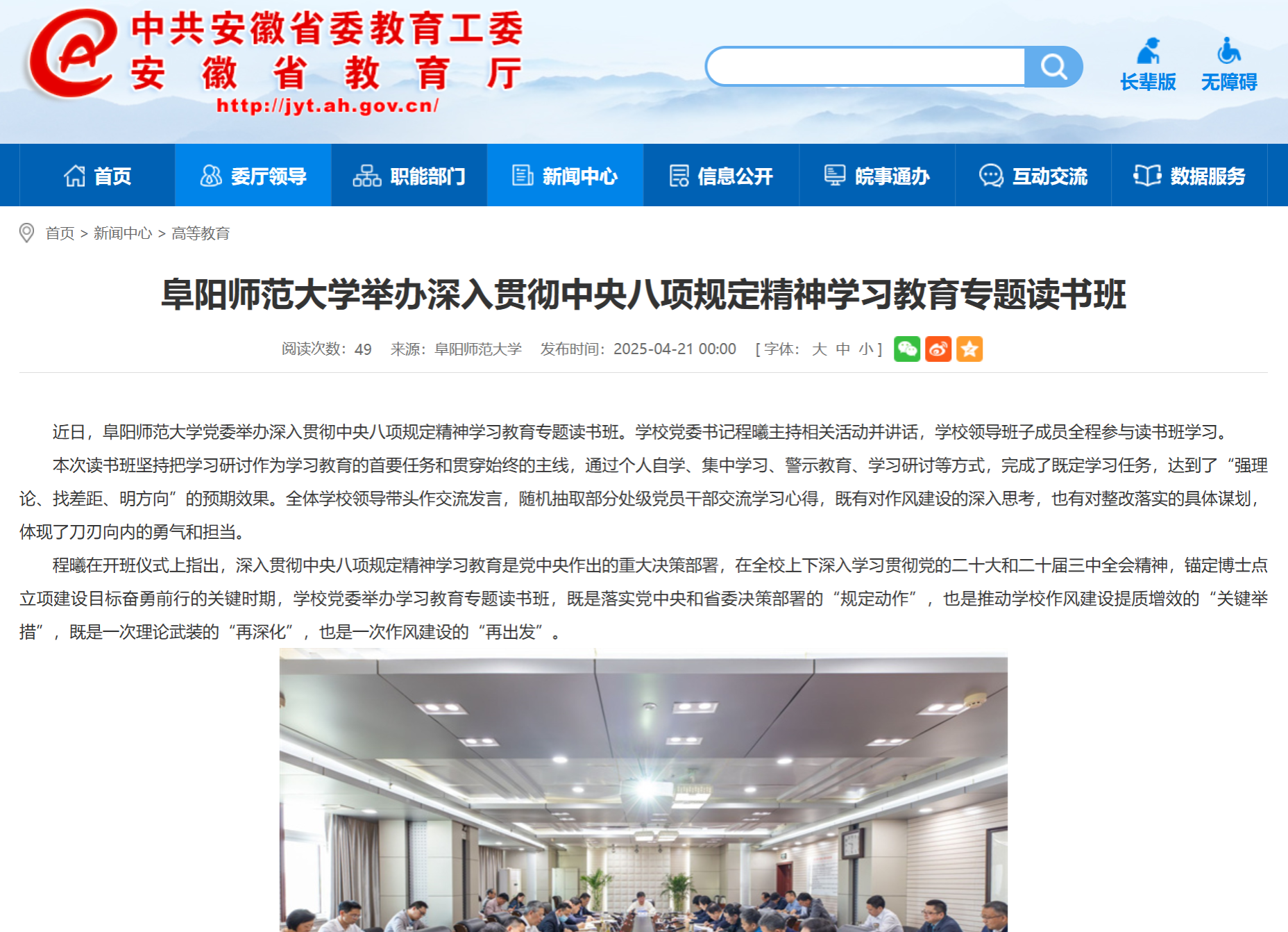 安徽教育网报道: 阜阳师范大学举办深入贯彻中央八项规定精神学习教育专题读书班