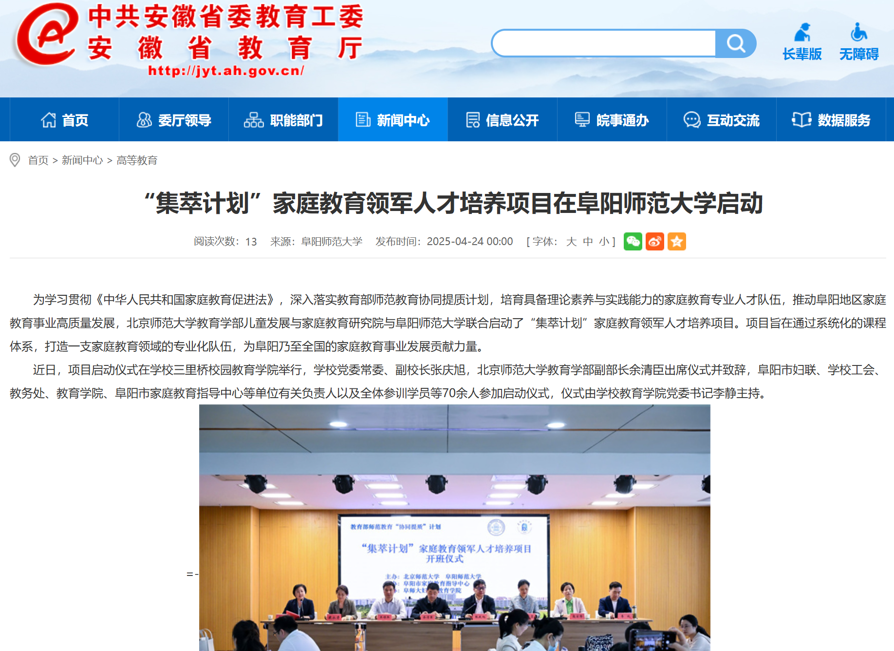 安徽教育网报道:“集萃计划”家庭教育领军人才培养项目在阜阳师范大学启动