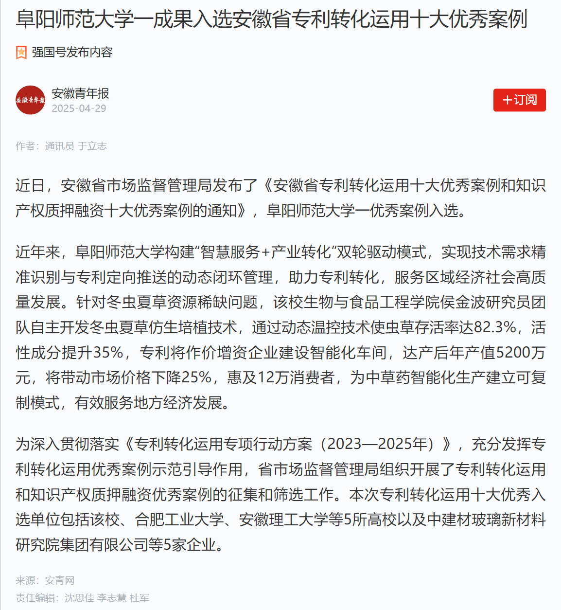4月29日,“学习强国”安徽青年报平台报道:阜阳师范大学一成果入选安徽省专利转化运用十大优秀案例。文章地址:https://article.xuexi.cn/articles/index.html?art_id=16690321569233354535&item_id=16690321569233354535&study_style_id=feeds_opaque&t=1745918976806&showmenu=false&ref_read_id=8d6d3ed2-1675-4135-8b80-9efdd29cb83b_1746695072788&pid=&ptype=-1&source=share&share_to=wx_single