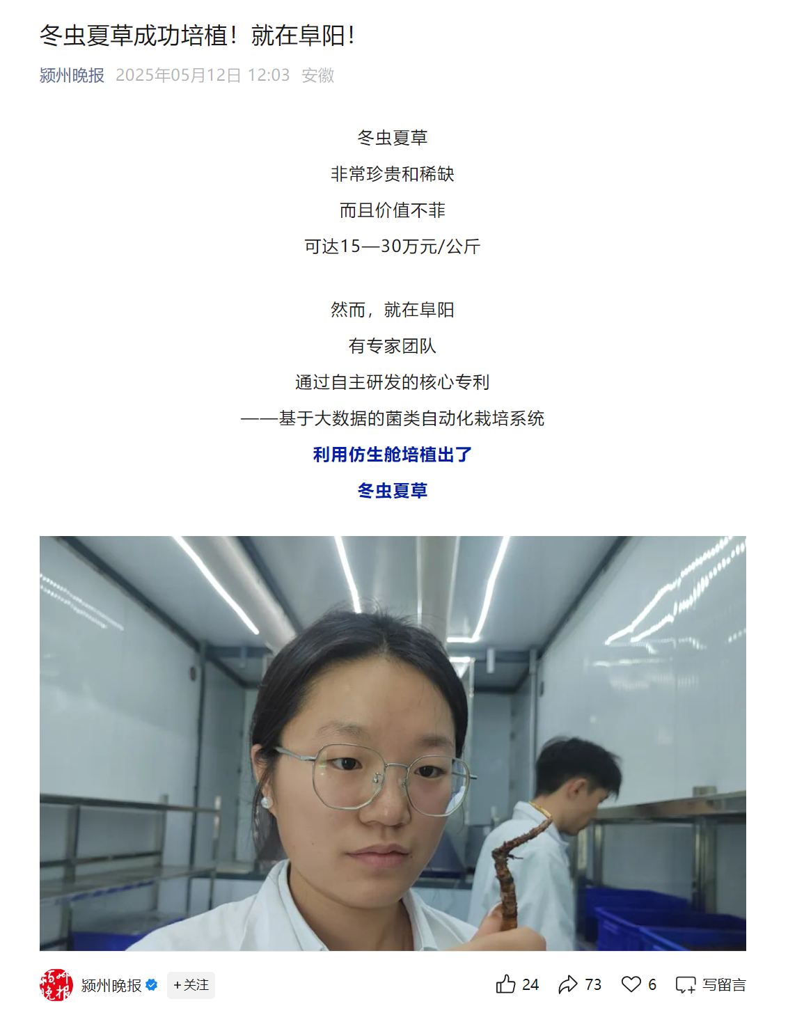 颍州晚报报道:冬虫夏草成功培植!就在阜阳!