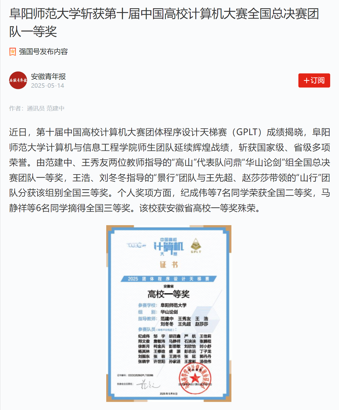5月14日,“学习强国”安徽青年报平台报道:阜阳师范大学斩获第十届中国高校计算机大赛全国总决赛团队一等奖。文章地址:https://article.xuexi.cn/articles/index.html?art_id=14574600533749657044&item_id=14574600533749657044&study_style_id=feeds_opaque&pid=&ptype=-1&source=share&share_to=wx_single