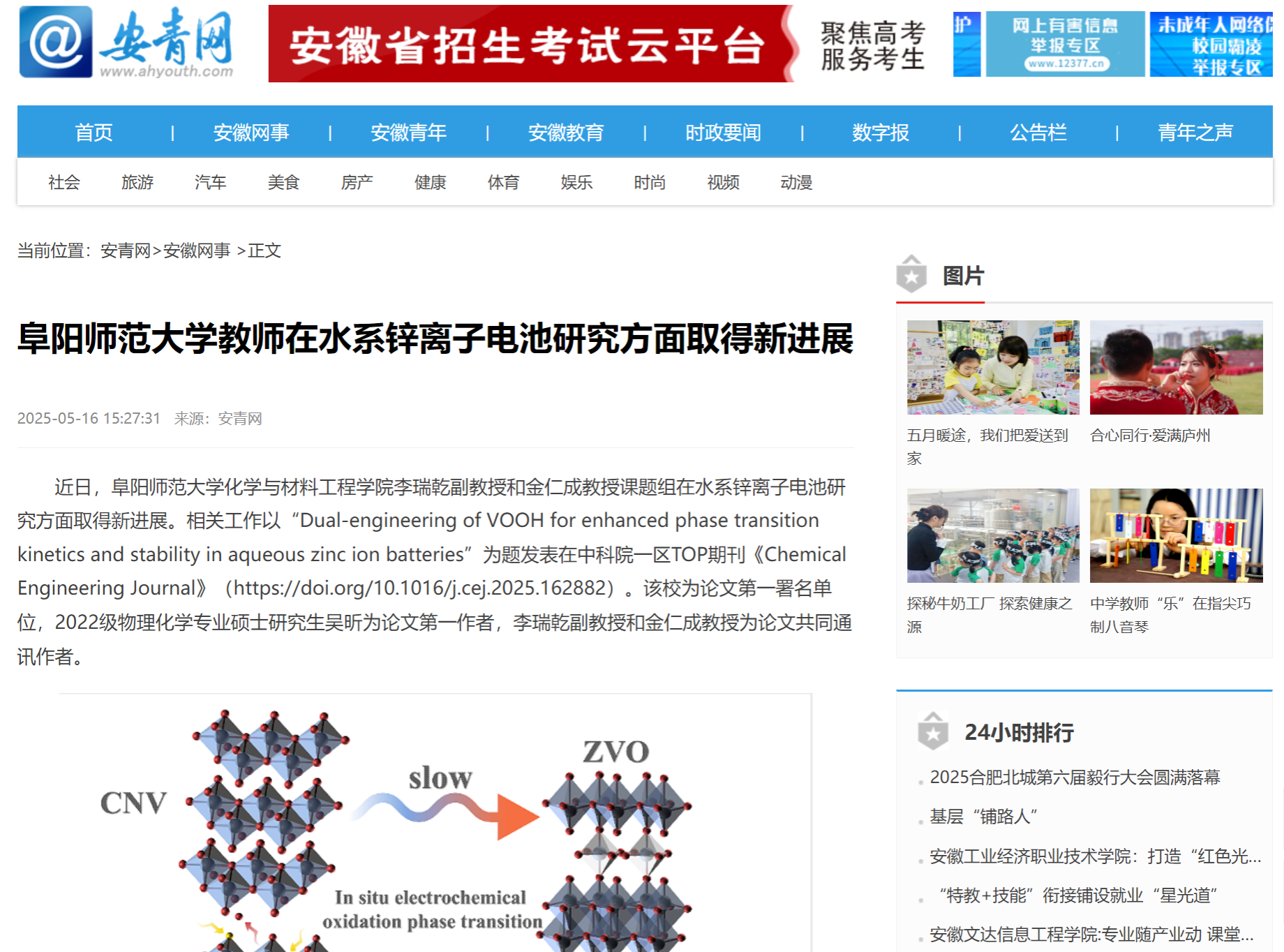 5月16日,安青网报道:阜阳师范大学教师在水系锌离子电池研究方面取得新进展。文章地址: