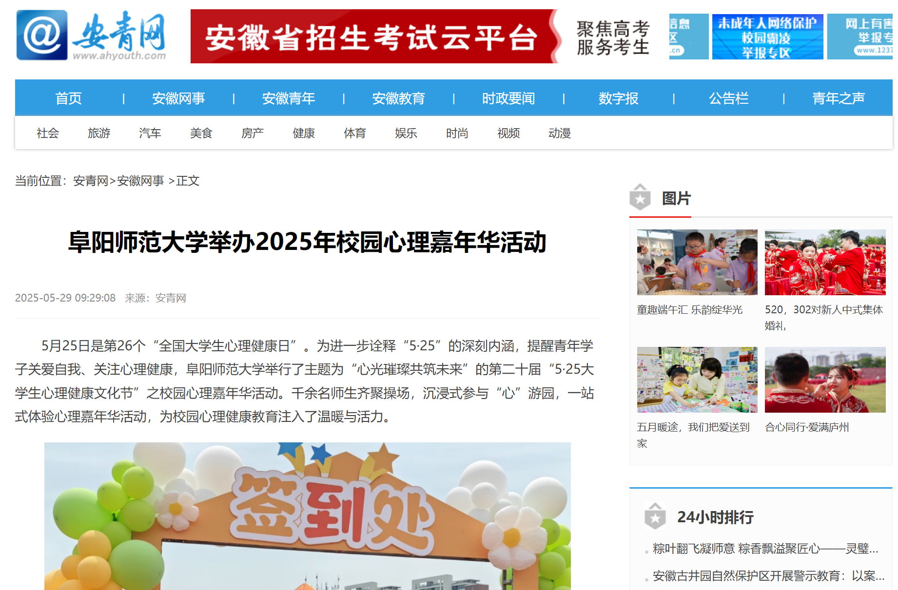 5月29日,安青网报道:阜阳师范大学举办2025年校园心理嘉年华活动。文章地址: