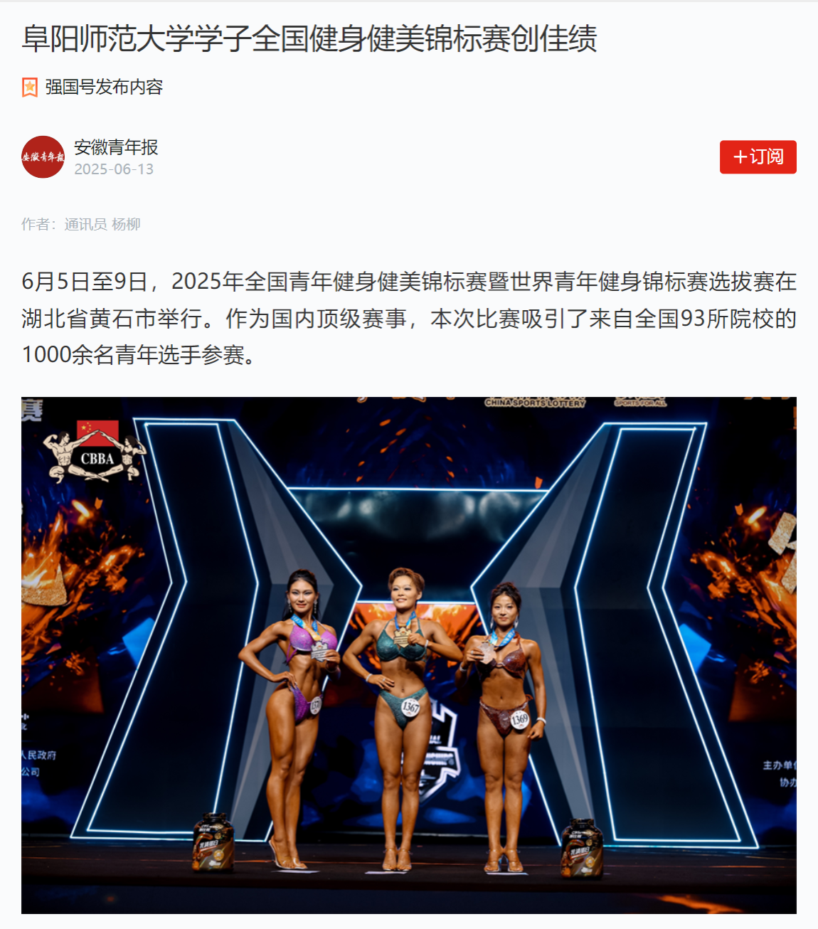 6月13日,“学习强国”安徽青年报平台报道:阜阳师范大学学子全国健身健美锦标赛创佳绩。文章地址:https://article.xuexi.cn/articles/index.html?art_id=10789906992137673750&source=share&study_style_id=feeds_opaque&reco_id=103238222b94c0a822a6000x&share_to=wx_single&study_share_enable=1&study_comment_disable=0&ptype=0&item_id=10789906992137673750