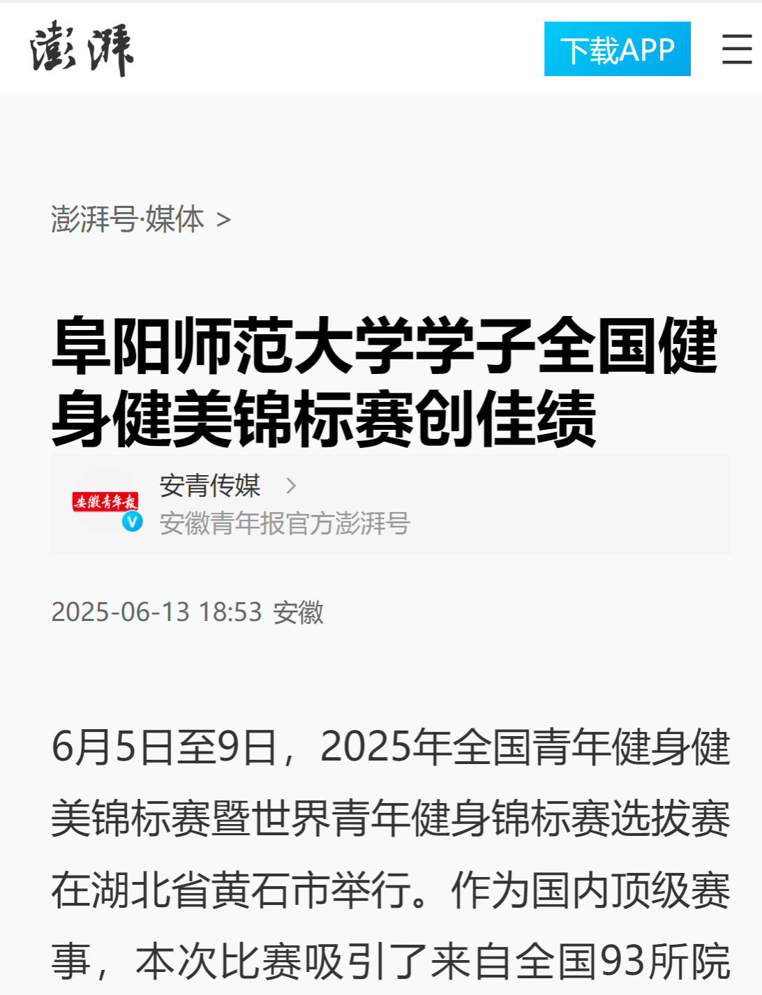 6月13日,澎湃新闻客户端报道:阜阳师范大学学子全国健身健美锦标赛创佳绩。文章地址:
