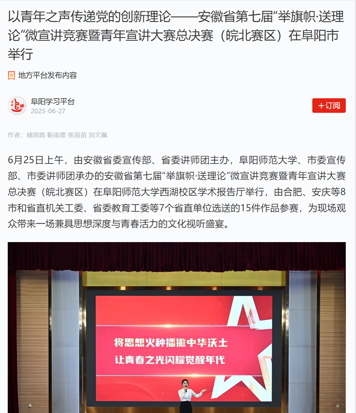 6月27日,“学习强国”阜阳学习平台报道:以青年之声传递党的创新理论——安徽省第七届“举旗帜·送理论”微宣讲竞赛暨青年宣讲大赛总决赛(皖北赛区)在阜阳市举行。文章地址:https://article.xuexi.cn/articles/index.html?art_id=14563395735078221496&source=share&cdn=https%3A%2F%2Fregion-anhui-resource&study_style_id=feeds_opaque&reco_id=10327fe1db53c0a823240005&share_to=wx_single&study_share_enable=1&study_comment_disable=1&ptype=0&item_id=14563395735078221496
