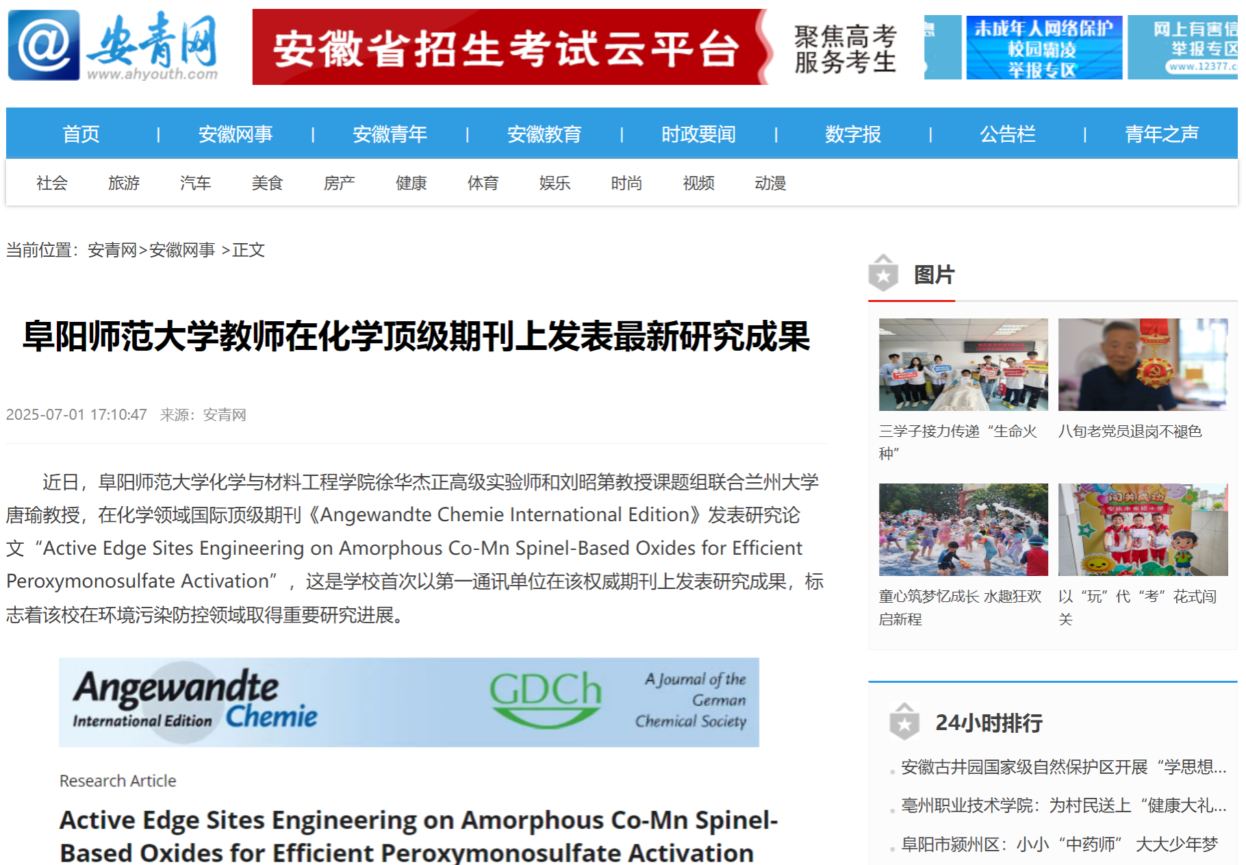 7月1日,安青网报道:阜阳师范大学教师在化学顶级期刊上发表最新研究成果。文章地址: