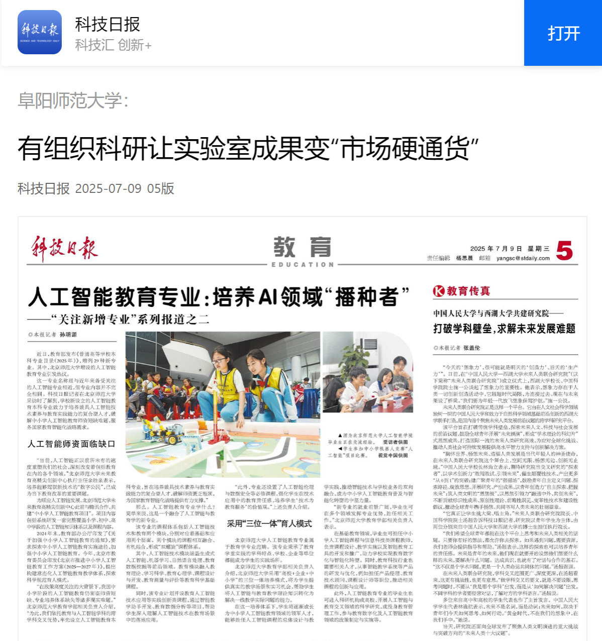 7月9日,科技日报报道:阜阳师范大学:有组织科研让实验室成果变“市场硬通货”。文章地址:https://app.kjrb.com.cn/app/template/displayTemplate/news/newsDetail/153240.html?isDigital=true&isShare=true&xyt=1752023060699