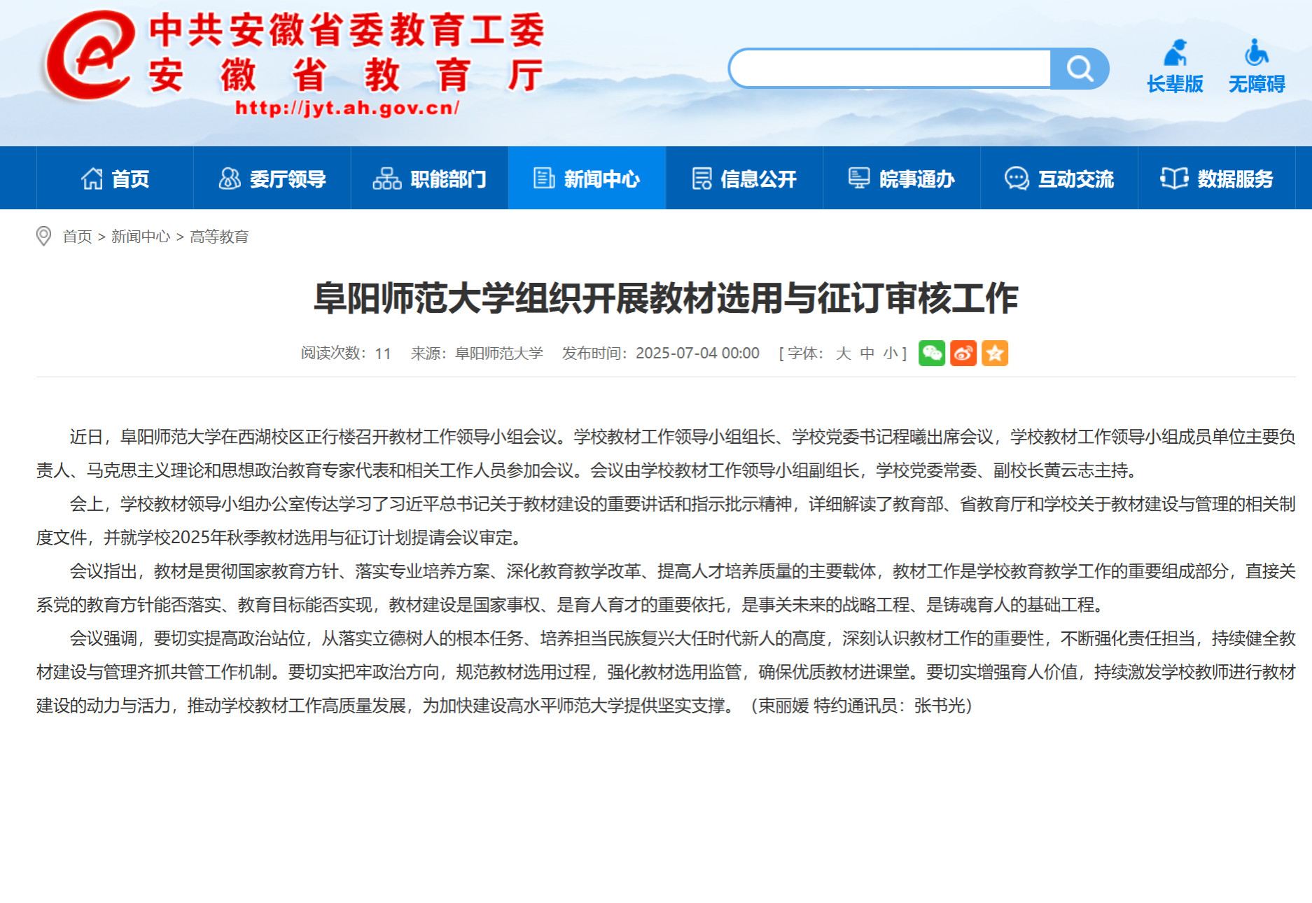7月4日,安徽教育网报道:阜阳师范大学组织开展教材选用与征订审核工作。文章地址: