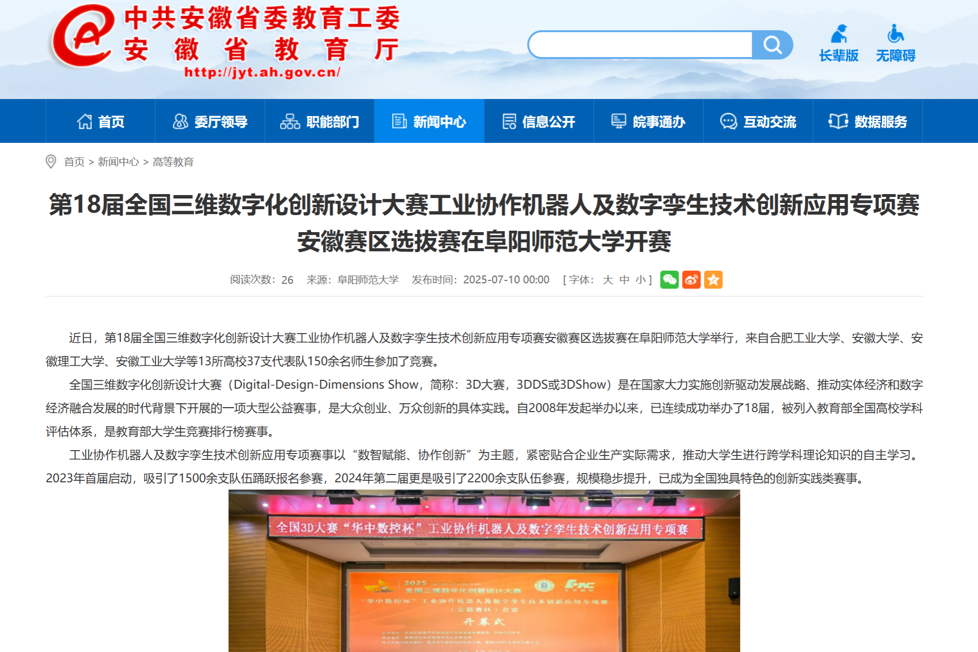 7月10日,安徽教育网报道:第18届全国三维数字化创新设计大赛工业协作机器人及数字孪生技术创新应用专项赛安徽赛区选拔赛在阜阳师范大学开赛。文章地址:https://jyt.ah.gov.cn/xwzx/gdjy/40757097.html