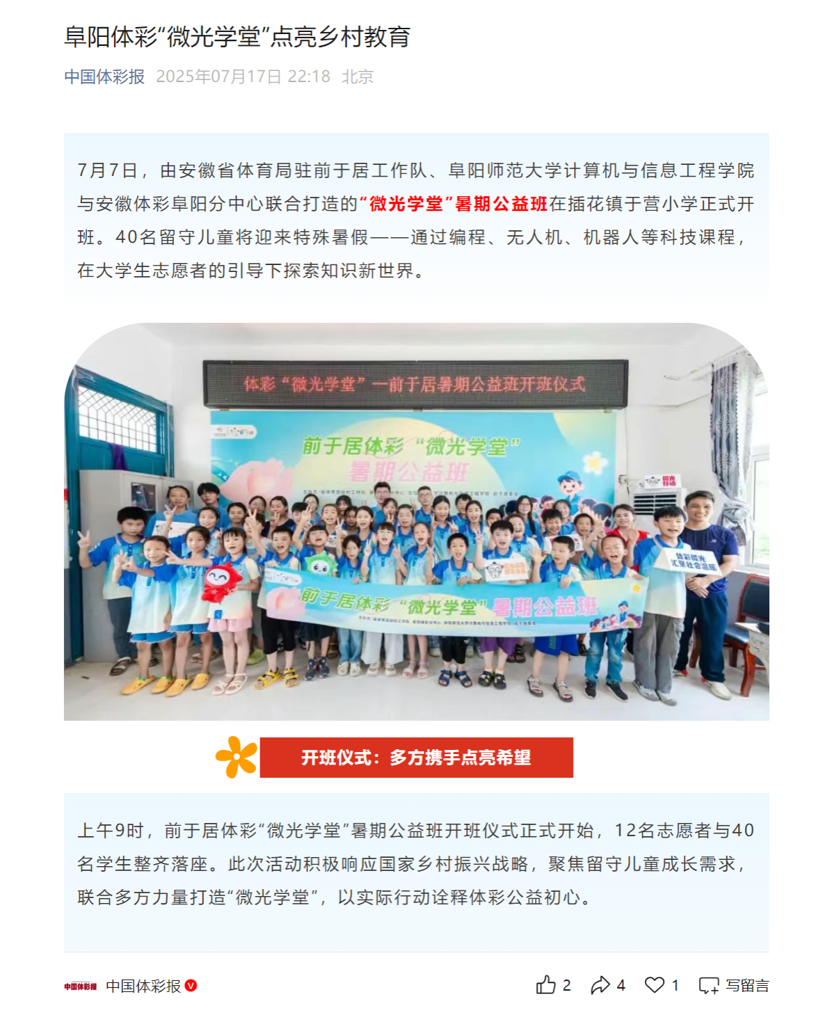 7月17日,中国体彩报平台报道:阜阳体彩“微光学堂”点亮乡村教育。文章地址: