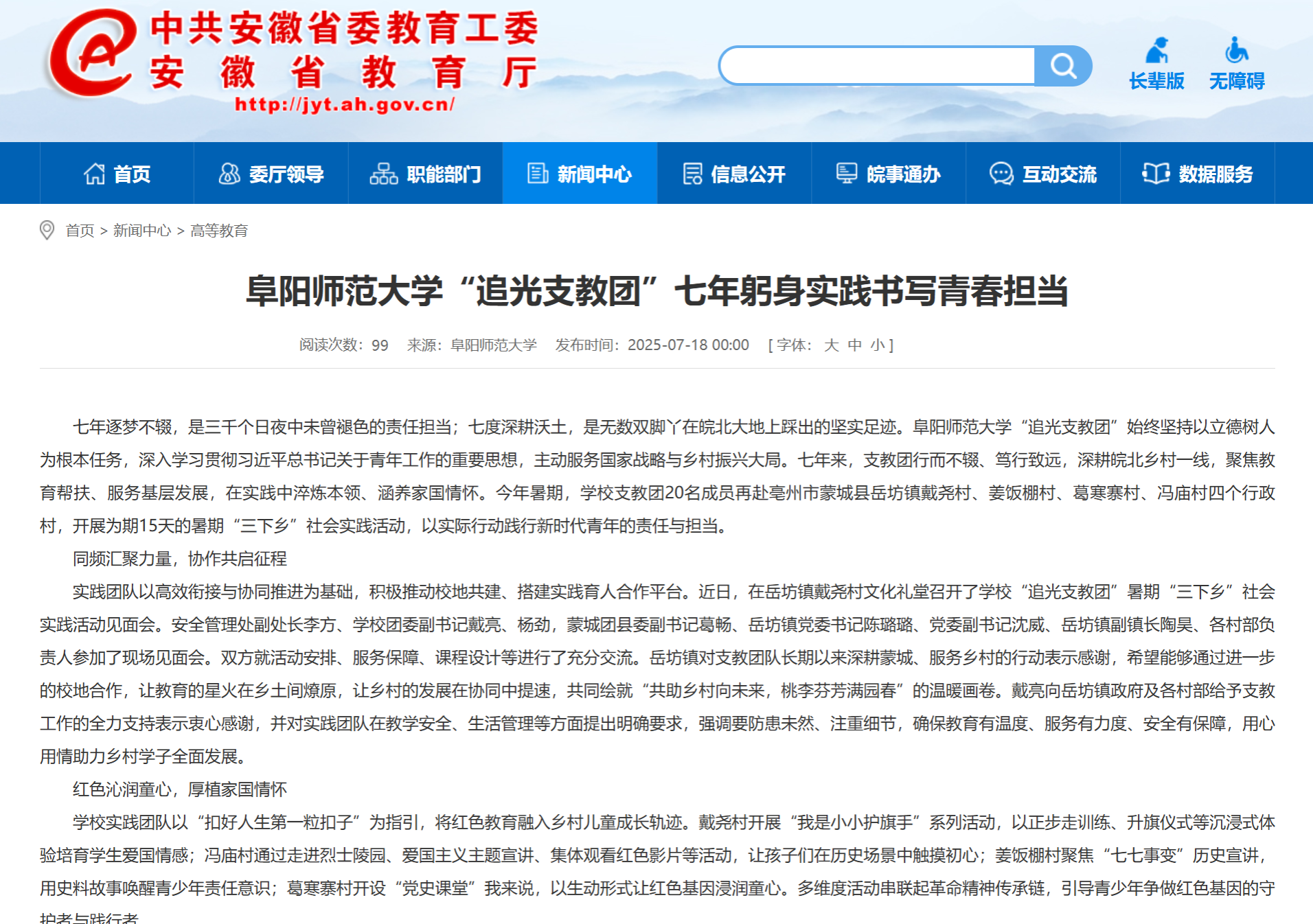 7月18日,安徽教育网报道:阜阳师范大学“追光支教团”七年躬身实践书写青春担当。文章地址: