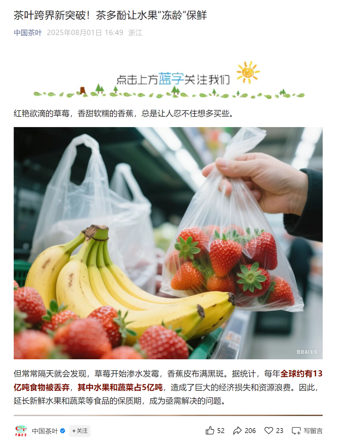 8月1日,中国茶叶报道:茶叶跨界新突破!茶多酚让水果“冻龄”保鲜。文章地址: