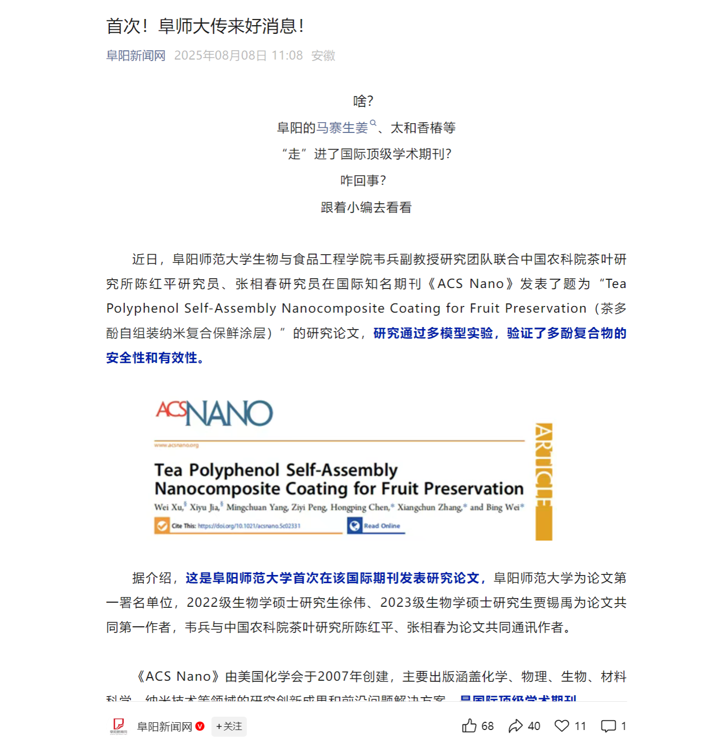 阜阳新闻网报道:首次!阜师大传来好消息!