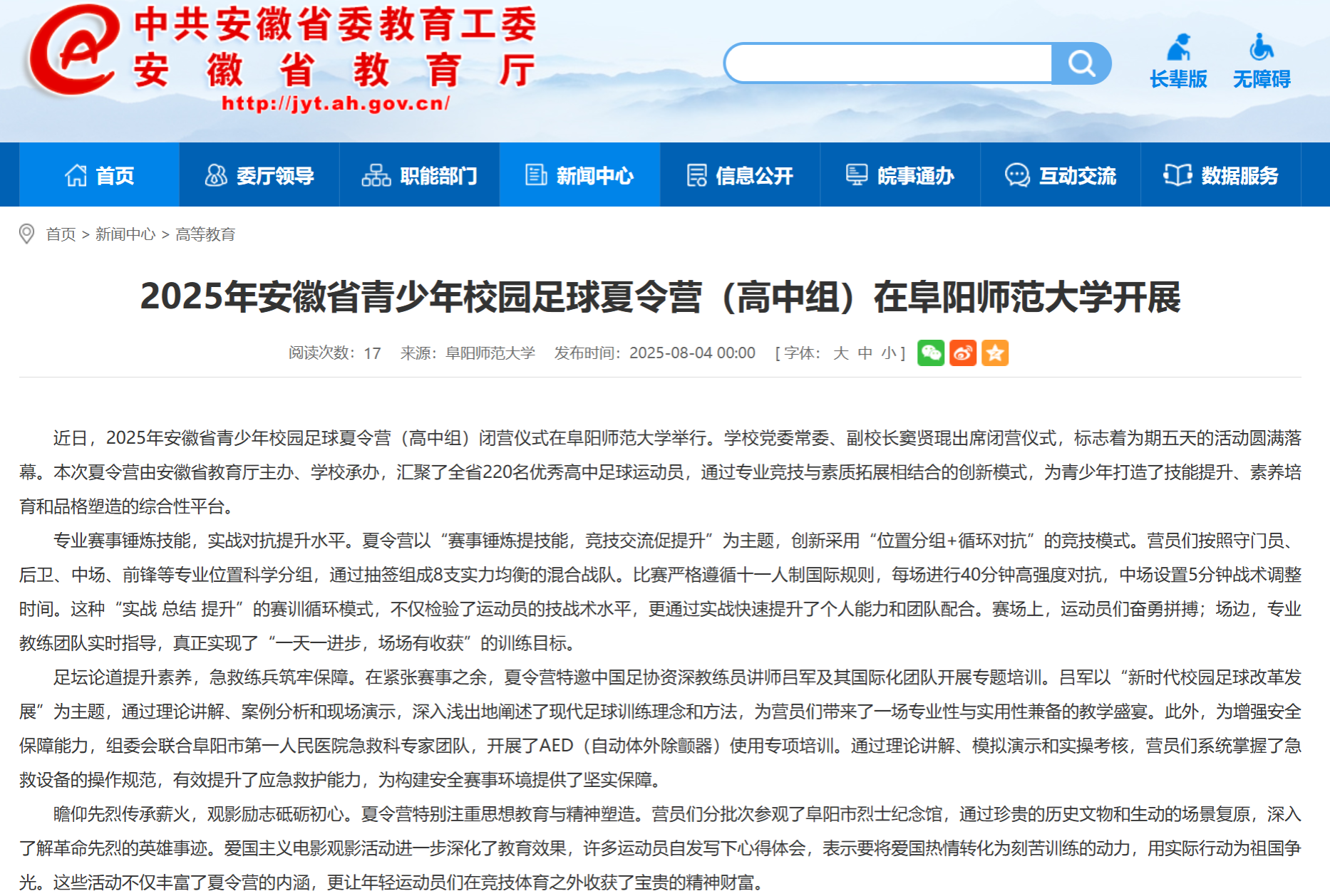 8月4日,安徽教育网报道:2025年安徽省青少年校园足球夏令营(高中组)在阜阳师范大学开展。文章地址: