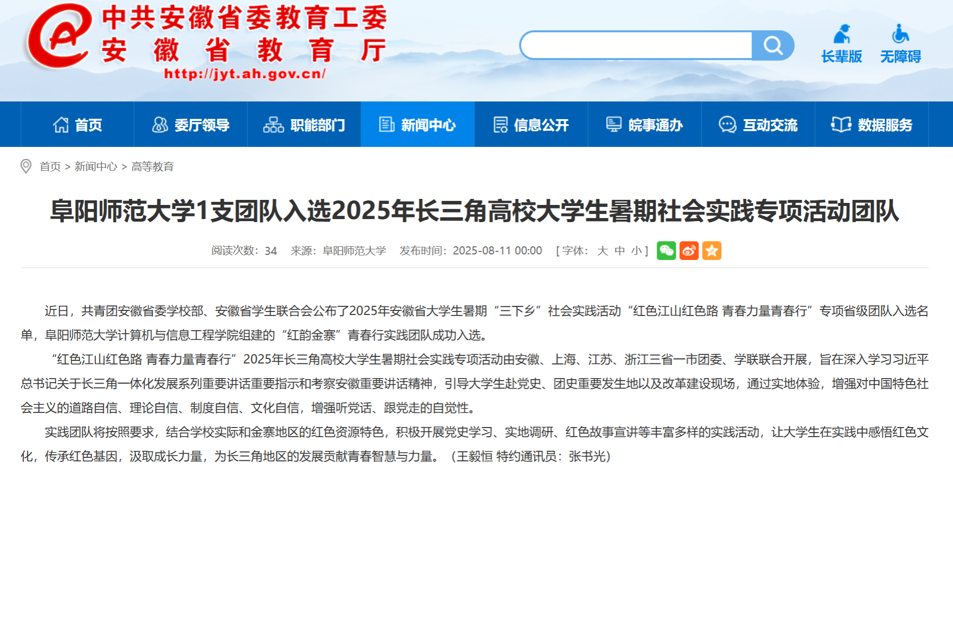 8月11日,安徽教育网报道:阜阳师范大学1支团队入选2025年长三角高校大学生暑期社会实践专项活动团队。文章地址:https://jyt.ah.gov.cn/xwzx/gdjy/40760075.html