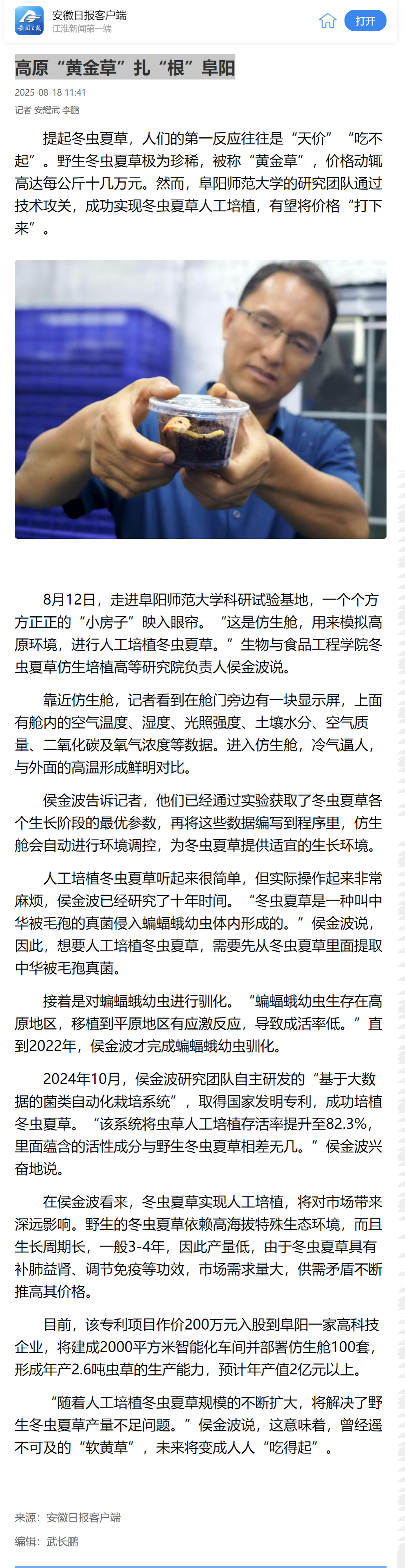 8月18日,安徽日报客户端报道:高原“黄金草”扎“根”阜阳。文章地址:https://app.ahnews.com.cn/displayTemplate/news/newsDetail/318/1524547.html?isShare=true&xyt=1755497183737