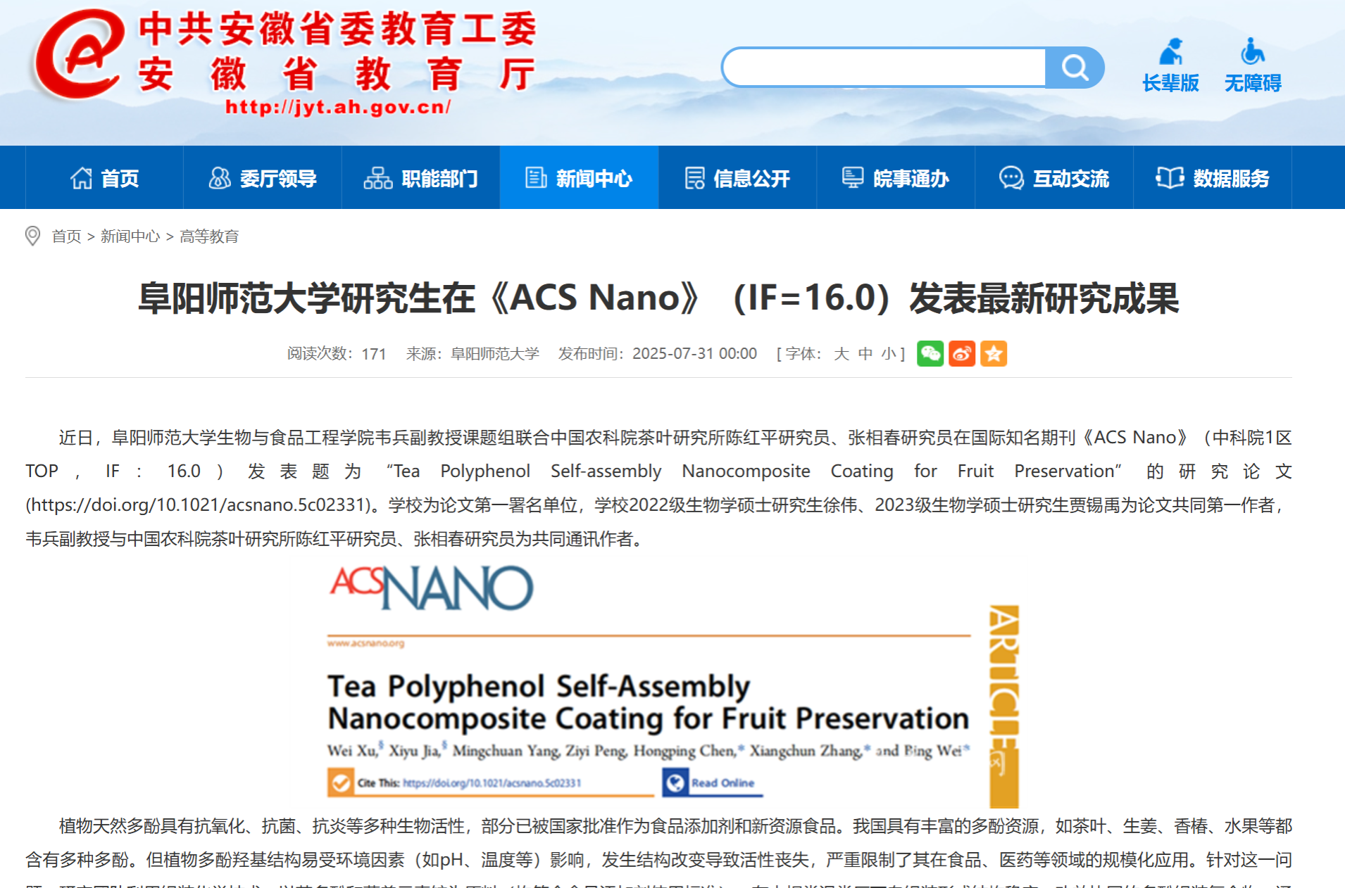 7月31日,安徽教育网报道:阜阳师范大学研究生在《ACS Nano》(IF=16.0)发表最新研究成果。文章地址:https://jyt.ah.gov.cn/xwzx/gdjy/40759177.html