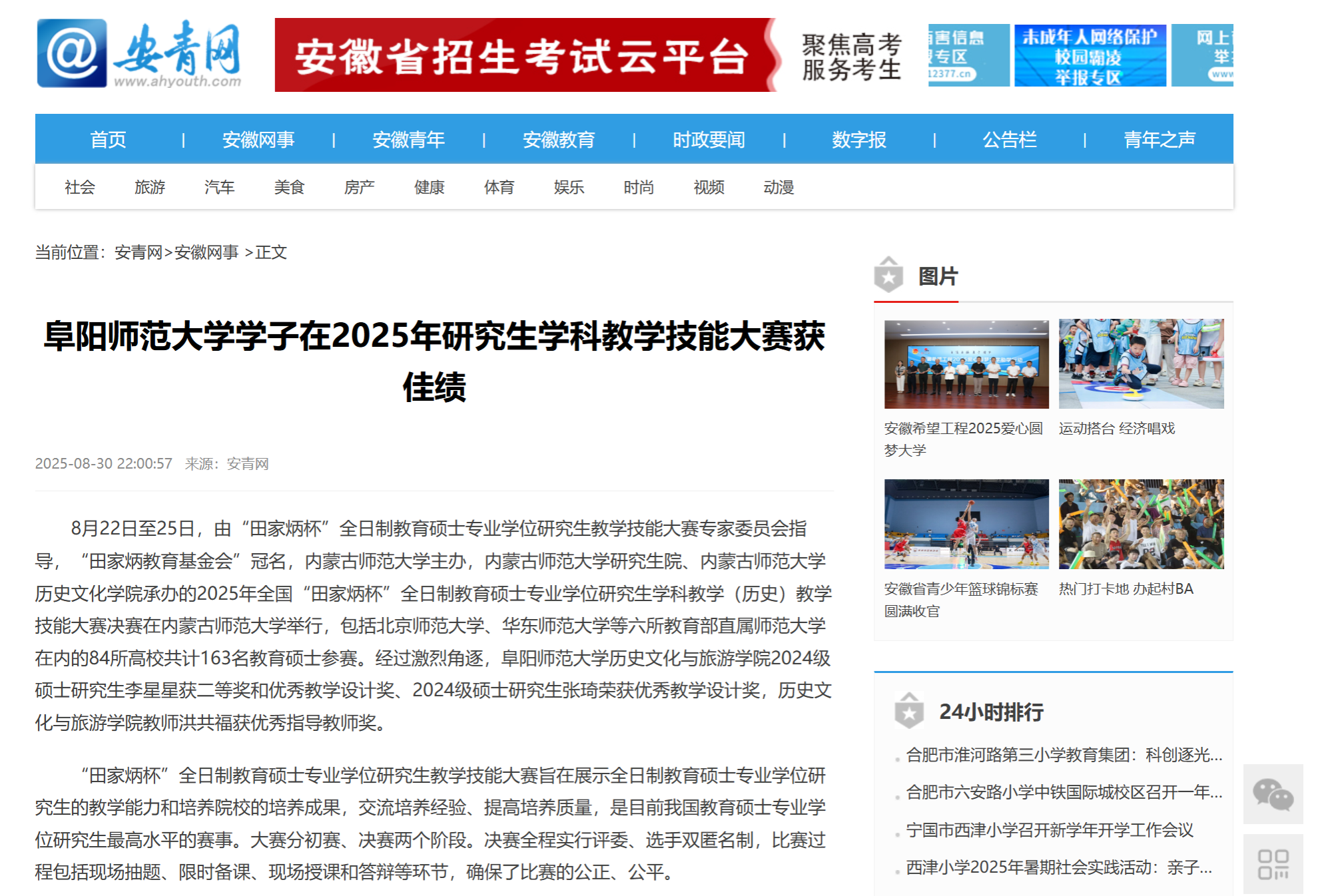 8月30日,安青网报道:阜阳师范大学学子在2025年研究生学科教学技能大赛获佳绩。文章地址:https://www.ahyouth.com/news/20250830/1766812.shtml?qq_aio_chat_type=2