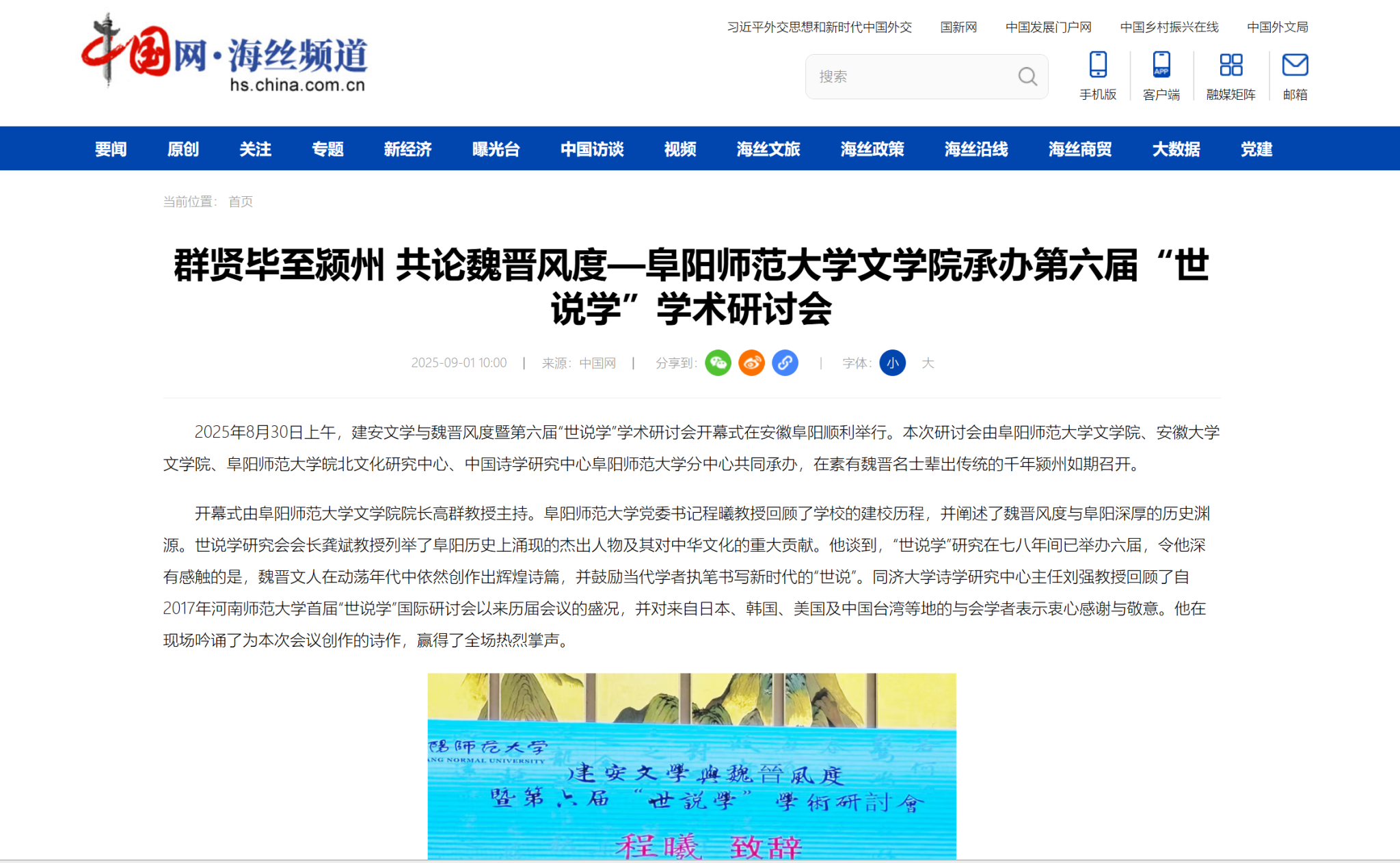 9月1日,中国网报道:群贤毕至颍州 共论魏晋风度—阜阳师范大学文学院承办第六届“世说学”学术研讨会。文章地址:http://hs.china.com.cn/2025-09/01/content_43217165.html