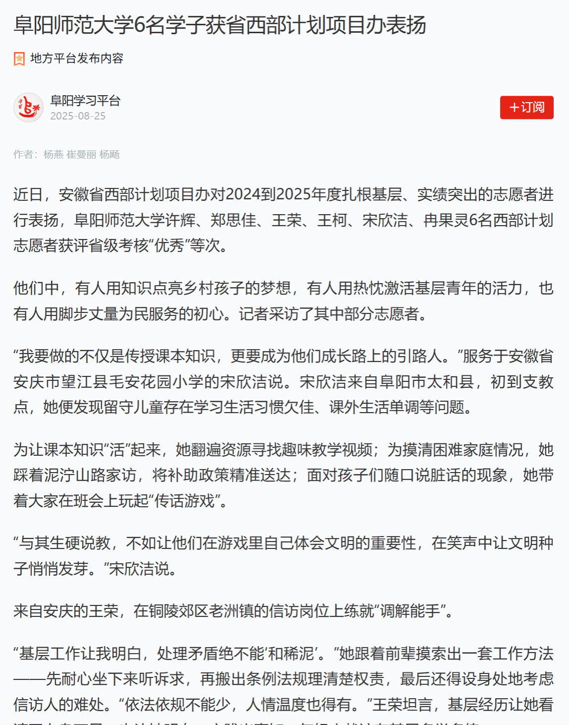 8月25日,“学习强国”阜阳学习平台报道:阜阳师范大学6名学子获省西部计划项目办表扬。文章地址:https://article.xuexi.cn/articles/index.html?art_id=7718036457953236068&cdn=https%3A%2F%2Fregion-anhui-resource&item_id=7718036457953236068&study_style_id=feeds_opaque&t=1756113241440&showmenu=false&ref_read_id=b736e296-22c7-4175-8c05-d0423e07509f&pid=&ptype=-1&source=share&share_to=wx_single