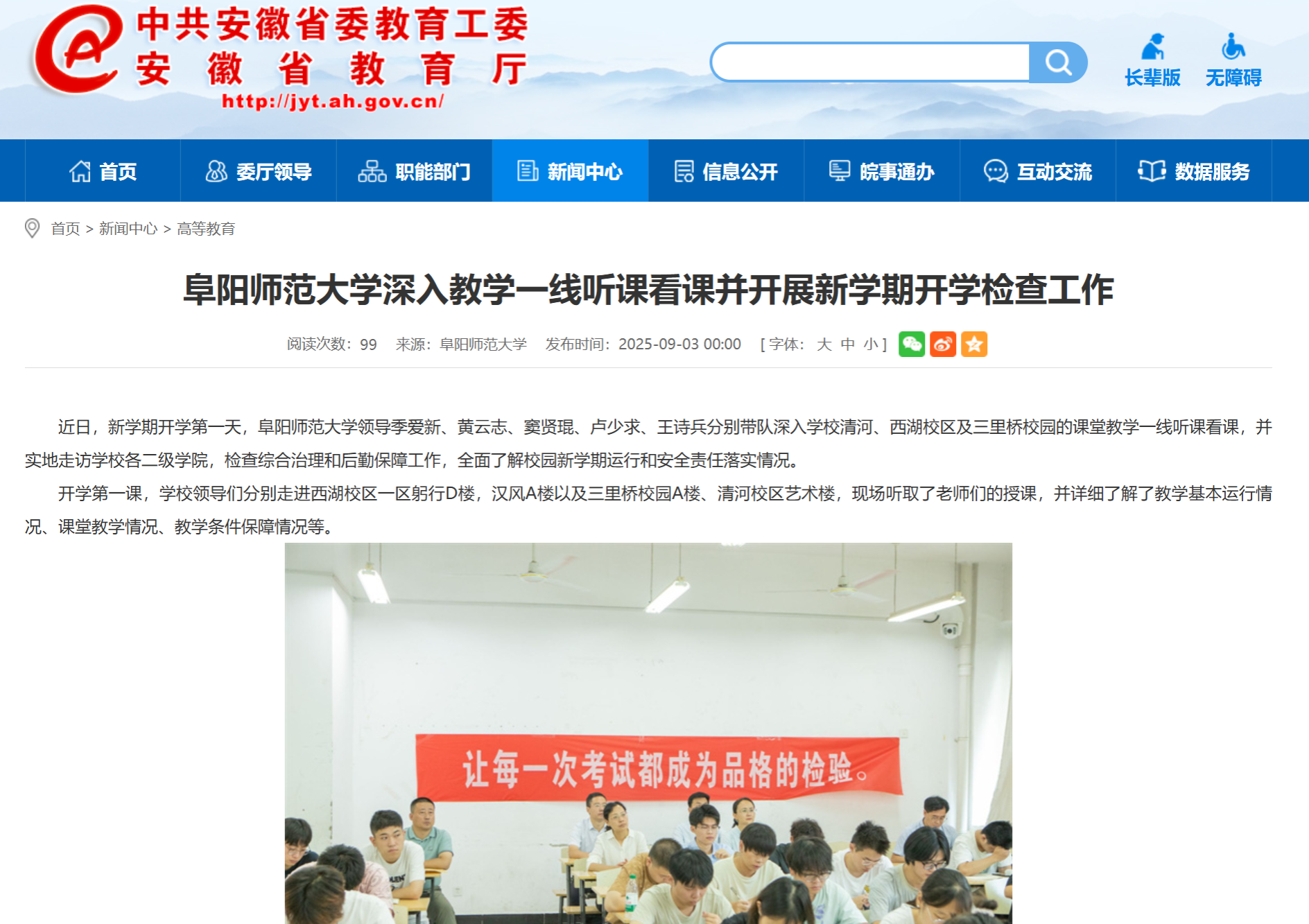 安徽教育网报道:阜阳师范大学深入教学一线听课看课并开展新学期开学检查工作