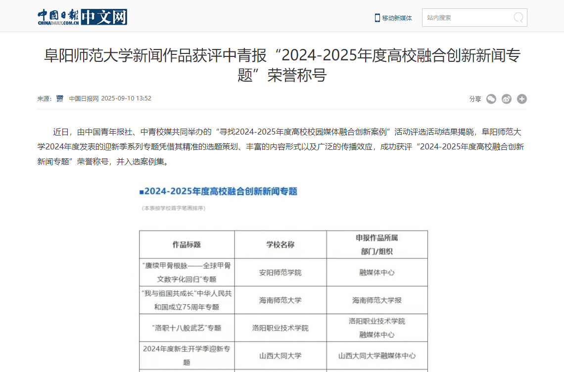 9月10日,中国日报网报道:阜阳师范大学新闻作品获评中青报“2024-2025年度高校融合创新新闻专题”荣誉称号。文章地址:http://cn.chinadaily.com.cn/a/202509/10/WS68c1122ea310f072577479c0.html