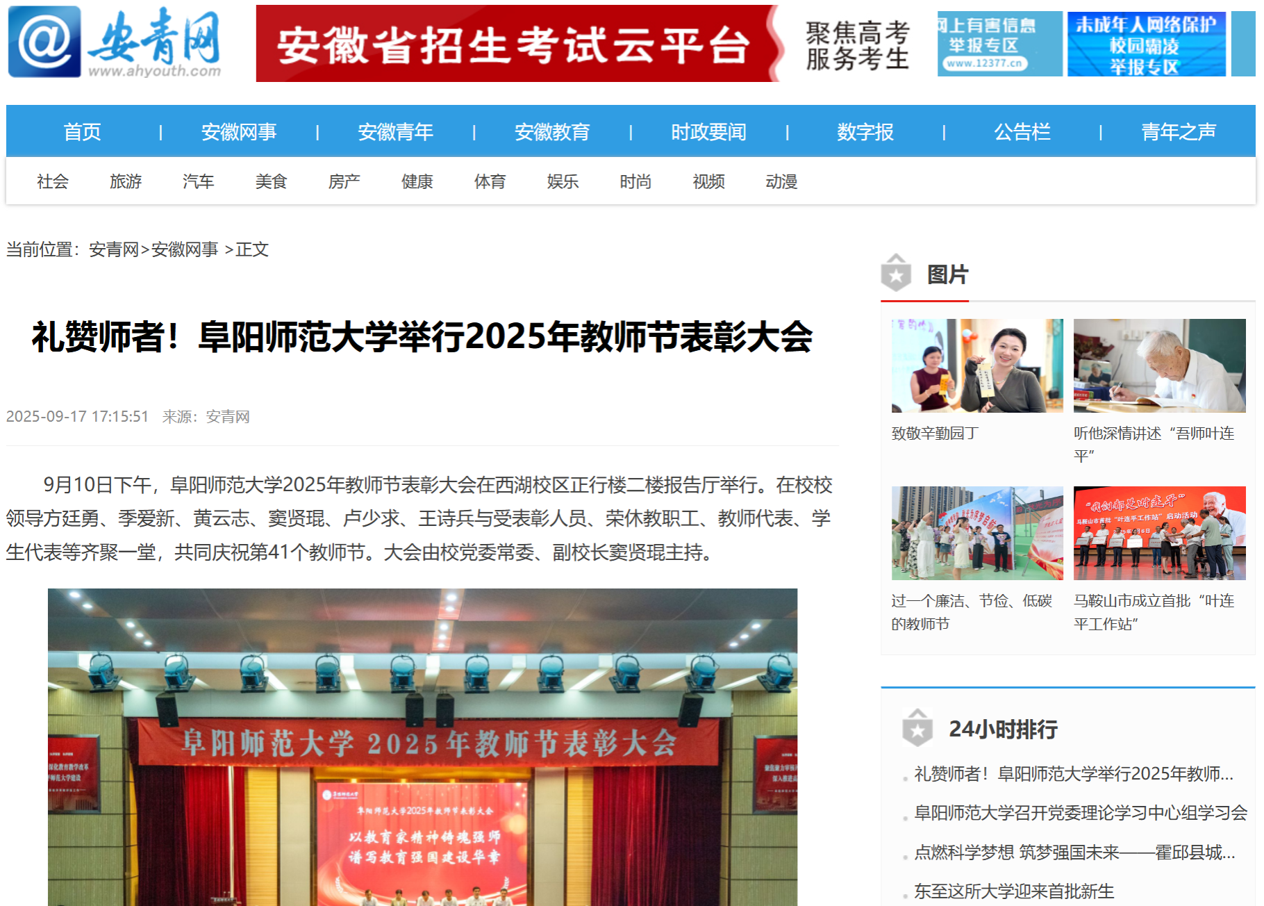 9月17日,安青网报道:礼赞师者!阜阳师范大学举行2025年教师节表彰大会。文章地址: