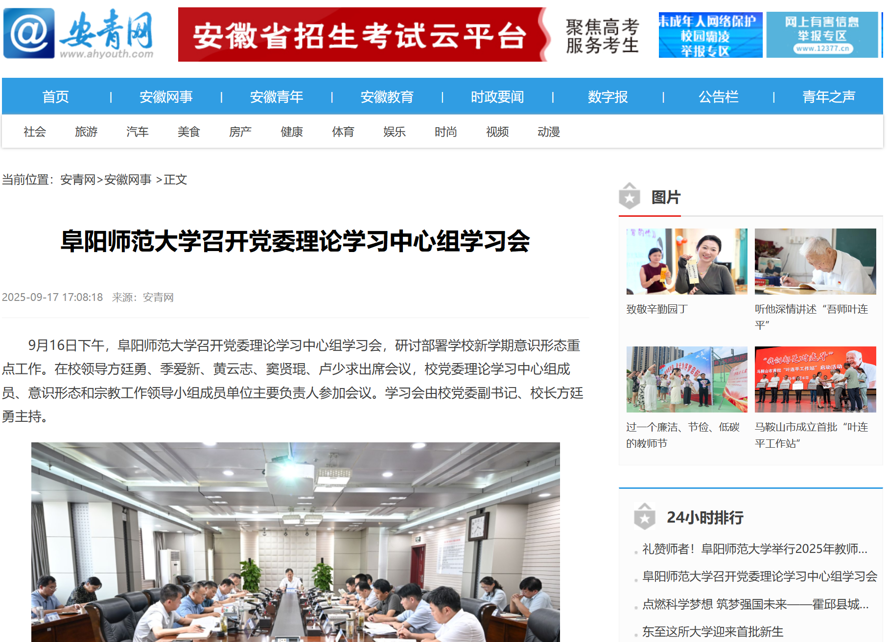 9月17日,安青网报道:阜阳师范大学召开党委理论学习中心组学习会。文章地址: