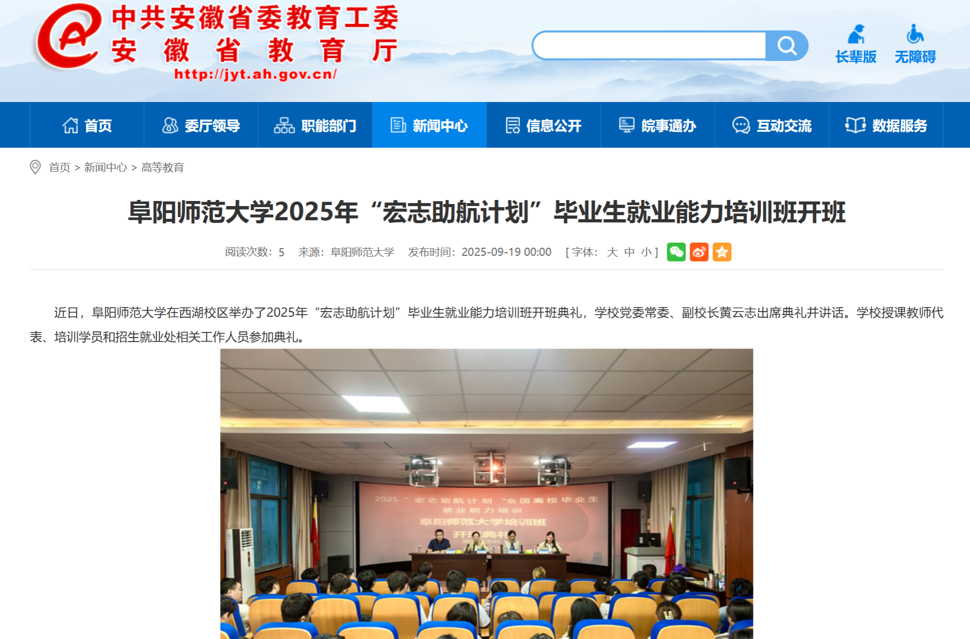 9月19日,安徽教育网报道:阜阳师范大学2025年“宏志助航计划”毕业生就业能力培训班开班。文章地址: