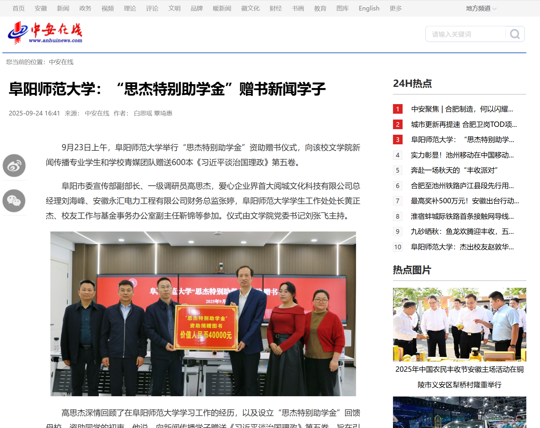 9月24日,中安在线报道:阜阳师范大学:“思杰特别助学金”赠书新闻学子。文章地址:http://ah.anhuinews.com/fy/jy/202509/t20250924_8805669.html