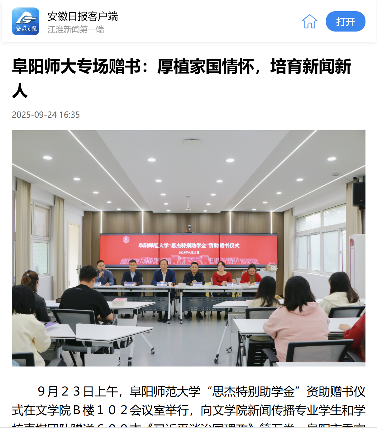 9月24日,安徽日报客户端报道:阜阳师大专场赠书:厚植家国情怀,培育新闻新人。文章地址:https://app.ahnews.com.cn/displayTemplate/news/newsDetail/3108/1562119.html?isShare=true