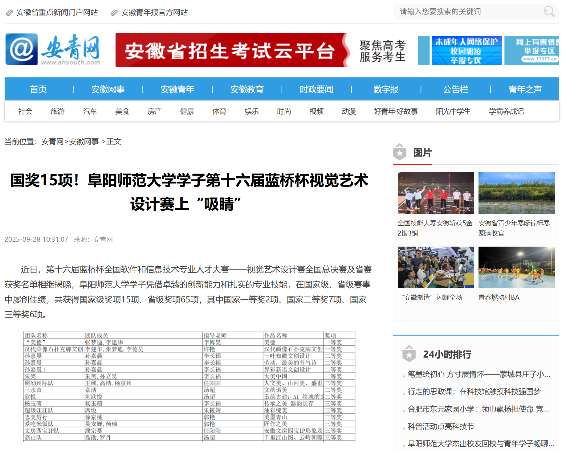 9月28日,安青网报道:国奖15项!阜阳师范大学学子第十六届蓝桥杯视觉艺术设计赛上“吸睛”。文章地址:https://www.ahyouth.com/news/20250928/1768912.shtml