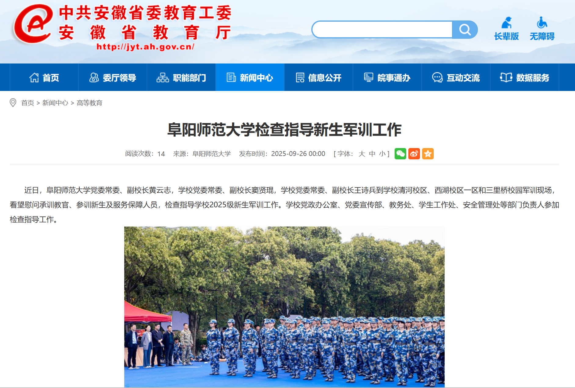 9月26日,安徽教育网报道: 阜阳师范大学检查指导新生军训工作。文章地址:html