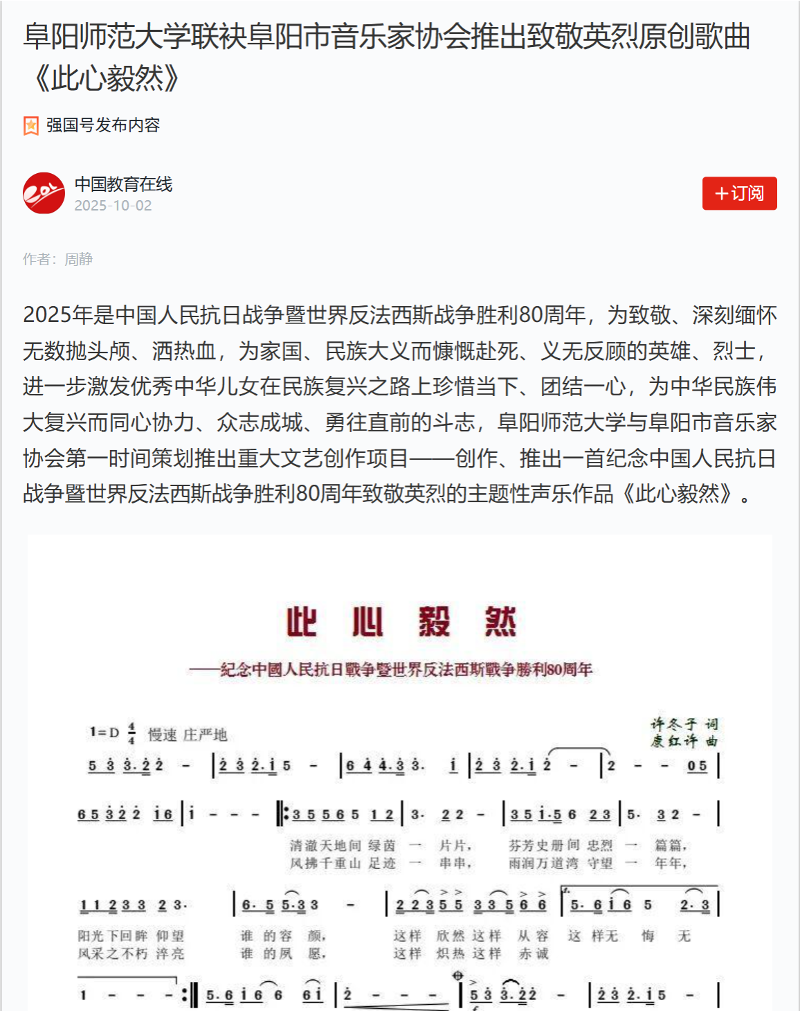 10月2日,“学习强国”中国教育在线平台报道:阜阳师范大学联袂阜阳市音乐家协会推出致敬英烈原创歌曲《此心毅然》。文章地址:https://article.xuexi.cn/articles/index.html?share_to=wx_single&qq_aio_chat_type=2&art_id=5717734577733035158&ptype=0&source=share&reco_id=1034741daba7c0a8857f000n&item_id=5717734577733035158&study_share_enable=1&study_style_id=feeds_opaque&study_comment_disable=0