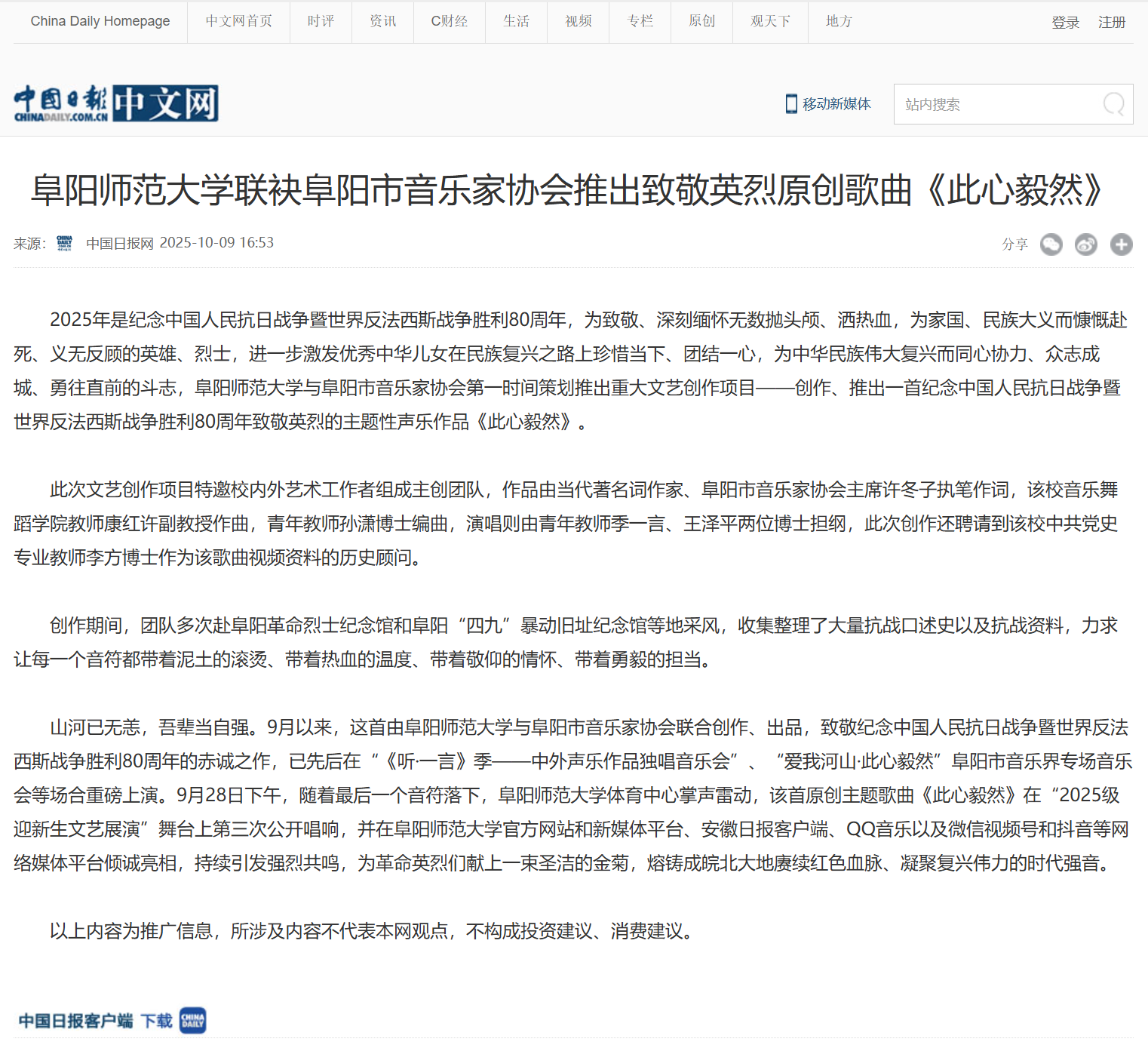 10月9日,中国日报网报道:阜阳师范大学联袂阜阳市音乐家协会推出致敬英烈原创歌曲《此心毅然》。文章地址:http://cn.chinadaily.com.cn/a/202510/09/WS68e7782aa310c4deea5eb813.html
