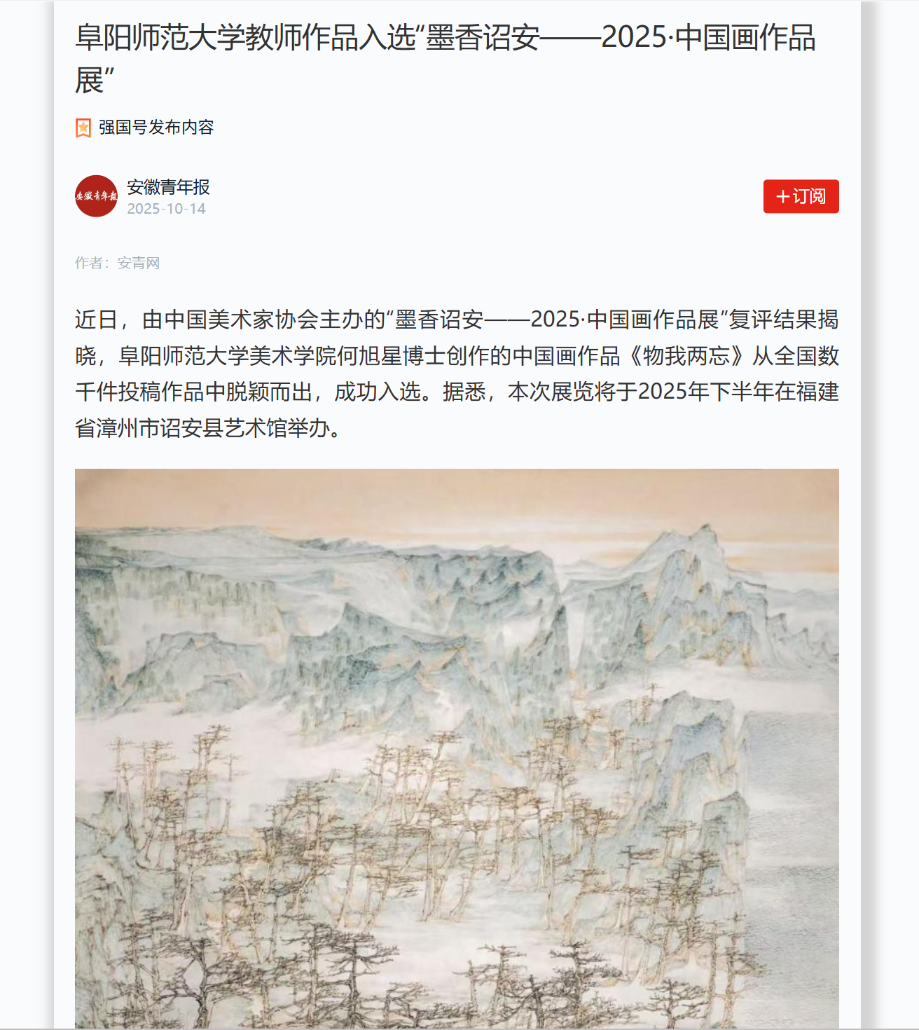 10月14日,“学习强国”安徽青年报平台报道:阜阳师范大学教师作品入选“墨香诏安——2025·中国画作品展”。文章地址:https://article.xuexi.cn/articles/index.html?art_id=4892355796062639980&item_id=4892355796062639980&study_style_id=feeds_opaque&pid=&ptype=-1&source=share&share_to=wx_single