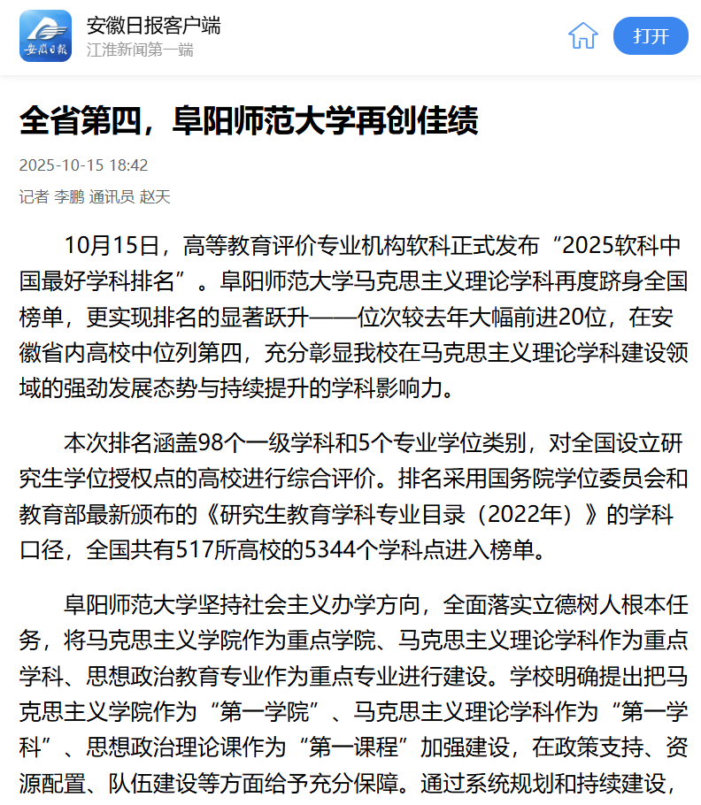 10月15日,安徽日报客户端报道:全省第四,阜阳师范大学再创佳绩。文章地址:https://app.ahnews.com.cn/displayTemplate/news/newsDetail/318/1576892.html?isShare=true