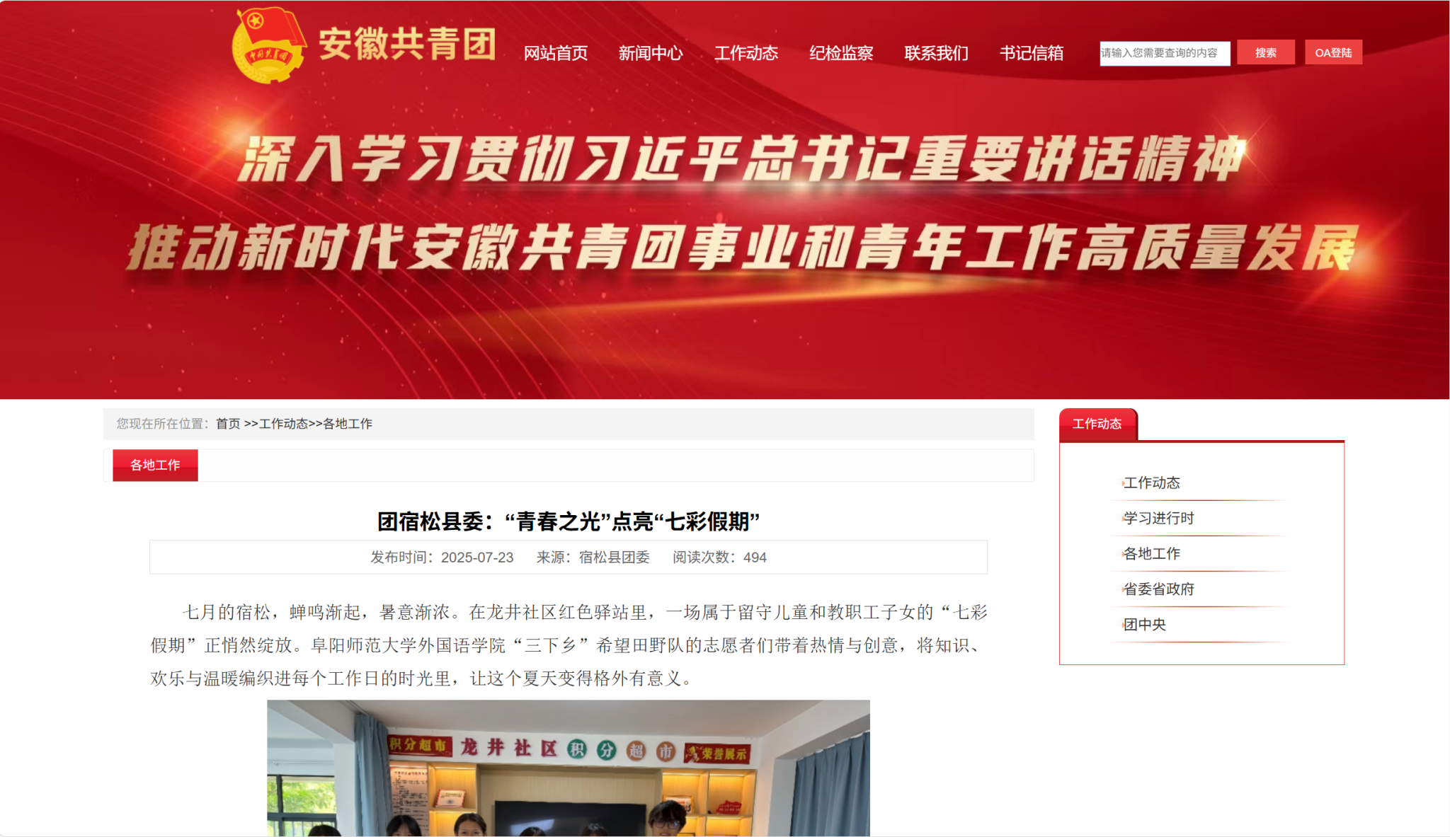 7月23日,安徽共青团报道:团宿松县委:“青春之光”点亮“七彩假期”。文章地址:https://www.ahyouth.org.cn/base/web/webNew/info_view.jsp?strId=1752712075884015135465#content