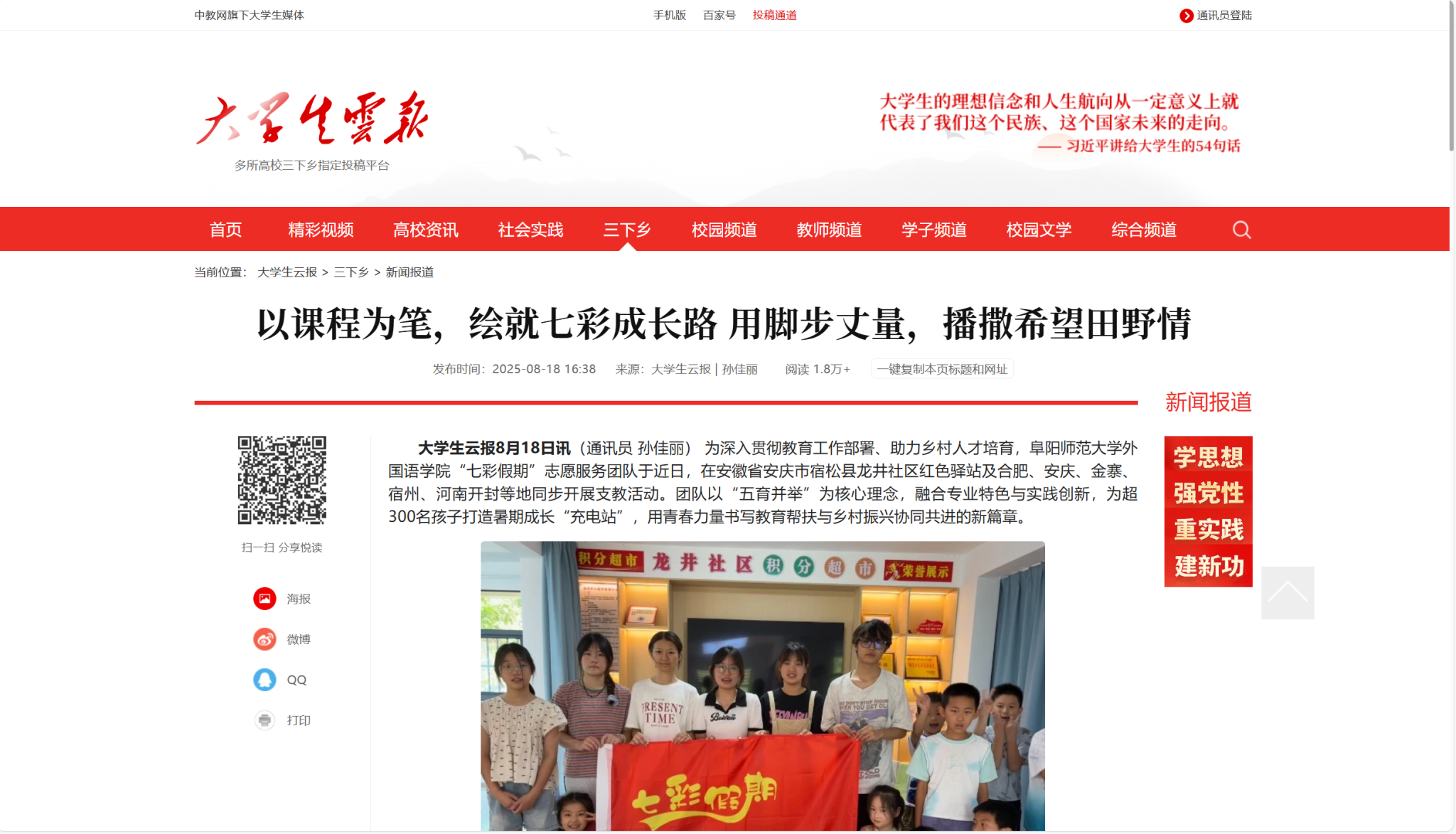 8月18日,大学生云报报道:以课程为笔,绘就七彩成长路 用脚步丈量,播撒希望田野情。文章地址:https://www.dxsyb.com/paper/2025/0818/789785.html?t=2823