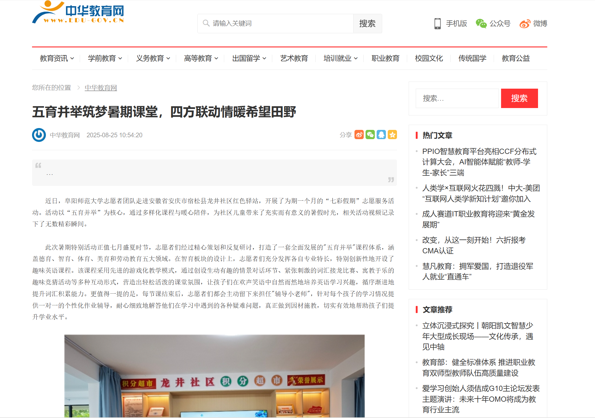 8月25日,中华教育网报道:五育并举筑梦暑期课堂,四方联动情暖希望田野。文章地址: