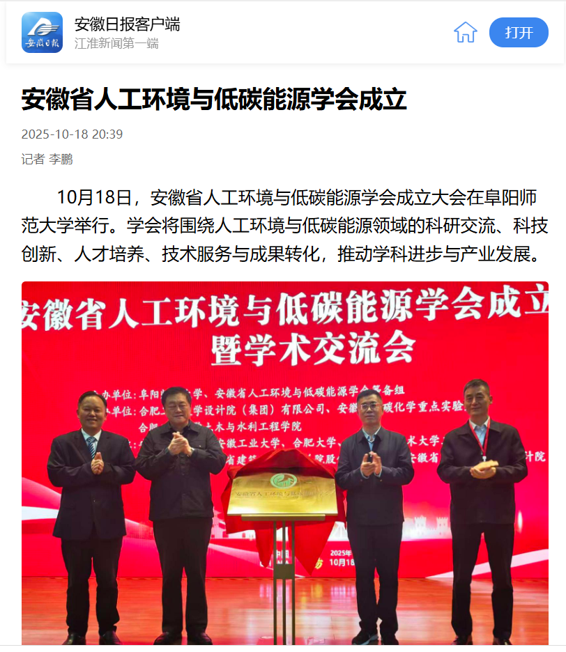 10月18日,安徽日报客户端报道:安徽省人工环境与低碳能源学会成立。https://app.ahnews.com.cn/displayTemplate/news/newsDetail/318/1579323.html?isShare=true&xyt=1760791245888