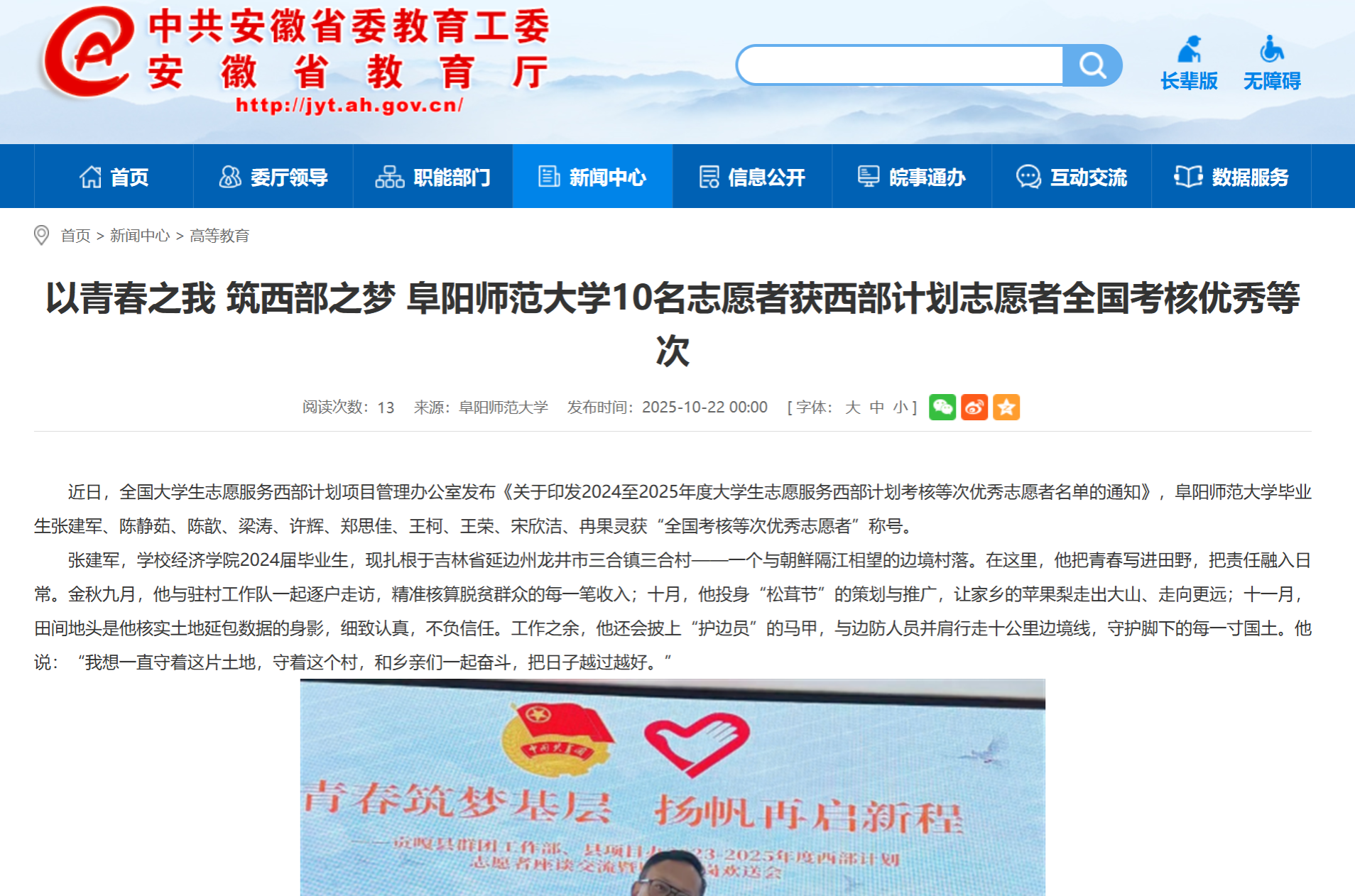 10月22日,安徽教育网报道:以青春之我 筑西部之梦 阜阳师范大学10名志愿者获西部计划志愿者全国考核优秀等次。文章地址:https://jyt.ah.gov.cn/xwzx/gdjy/40769977.html