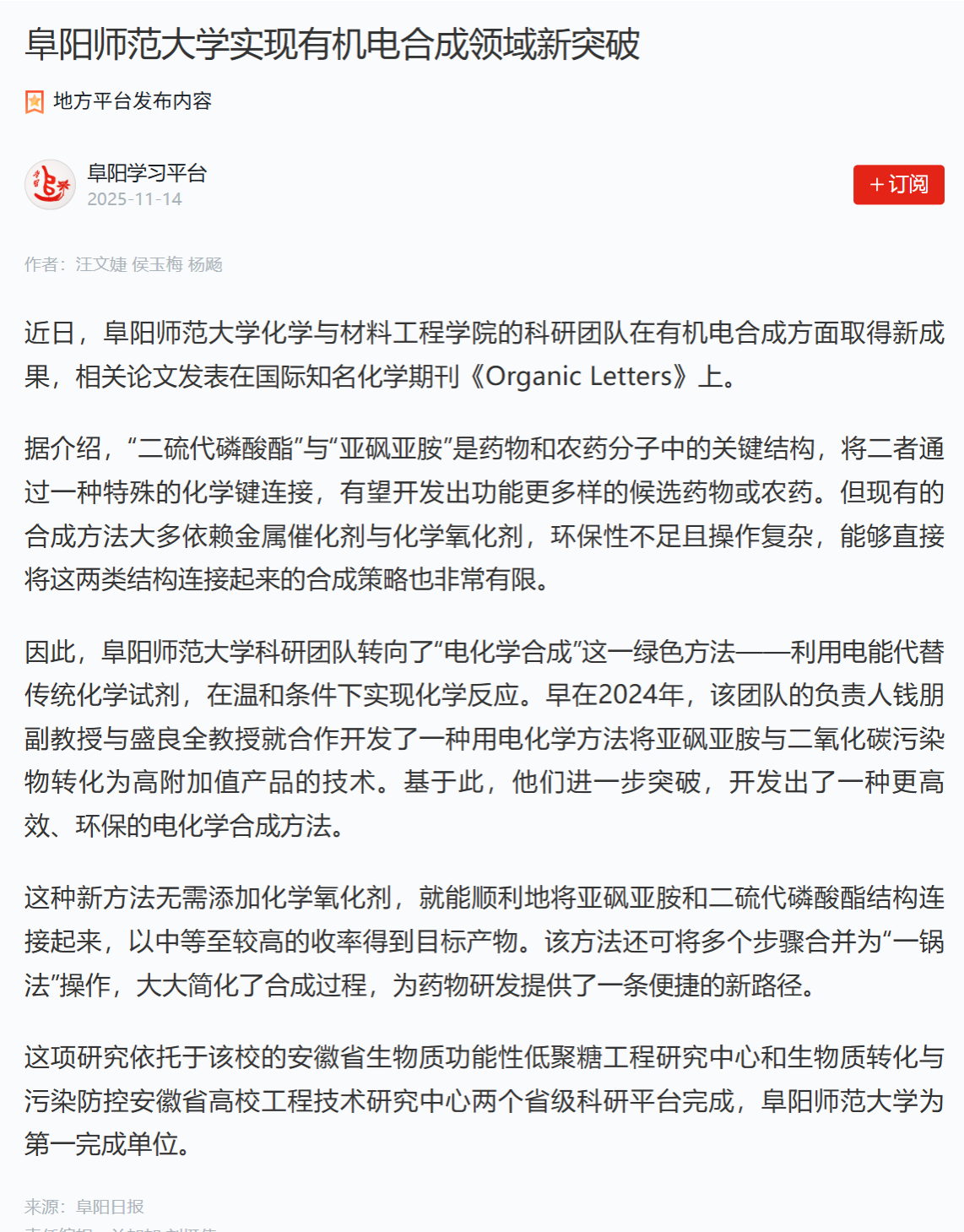 11月14日,“学习强国”阜阳学习平台报道:阜阳师范大学实现有机电合成领域新突破。文章地址:https://article.xuexi.cn/articles/index.html?art_id=18347872331728240165&cdn=https%3A%2F%2Fregion-anhui-resource&item_id=18347872331728240165&study_style_id=feeds_opaque&t=1763090202250&showmenu=false&ref_read_id=269bdd9f-8843-472f-beab-03abefdbfb7e&pid=&ptype=-1&source=share&share_to=wx_single