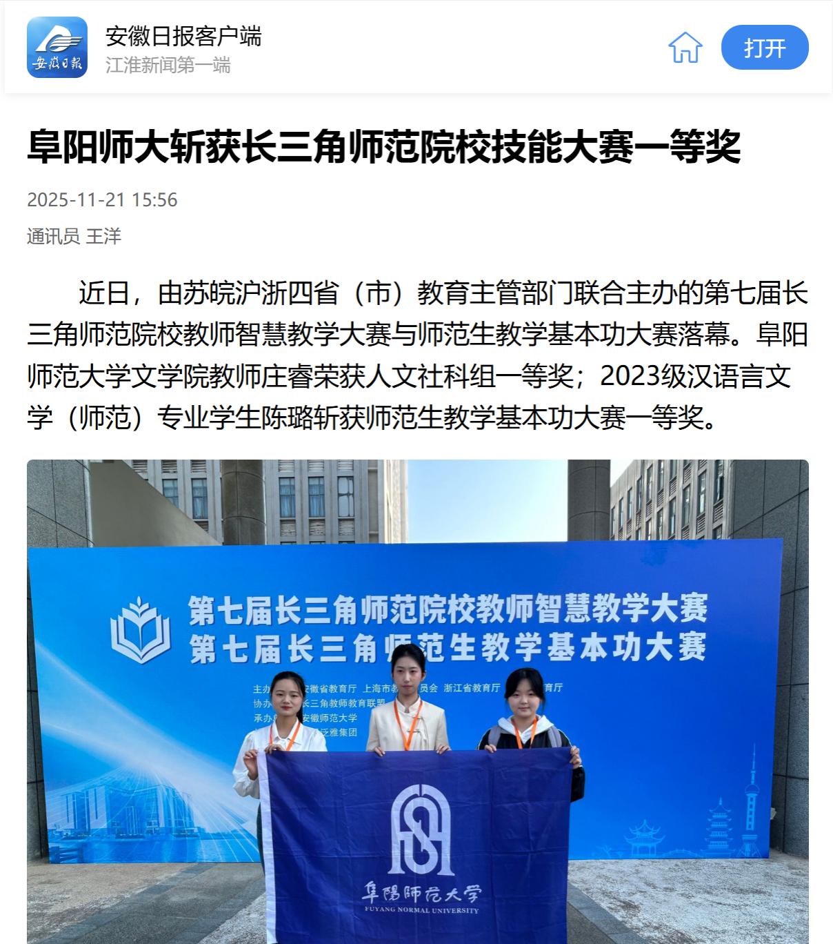 11月21日,安徽日报客户端报道:阜阳师大斩获长三角师范院校技能大赛一等奖。文章地址:https://app.ahnews.com.cn/displayTemplate/news/newsDetail/253/1609169.html?isShare=true&xyt=1763712747508